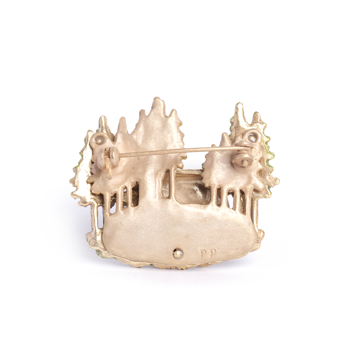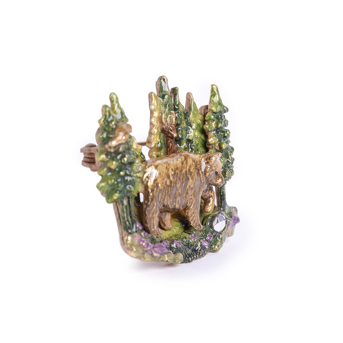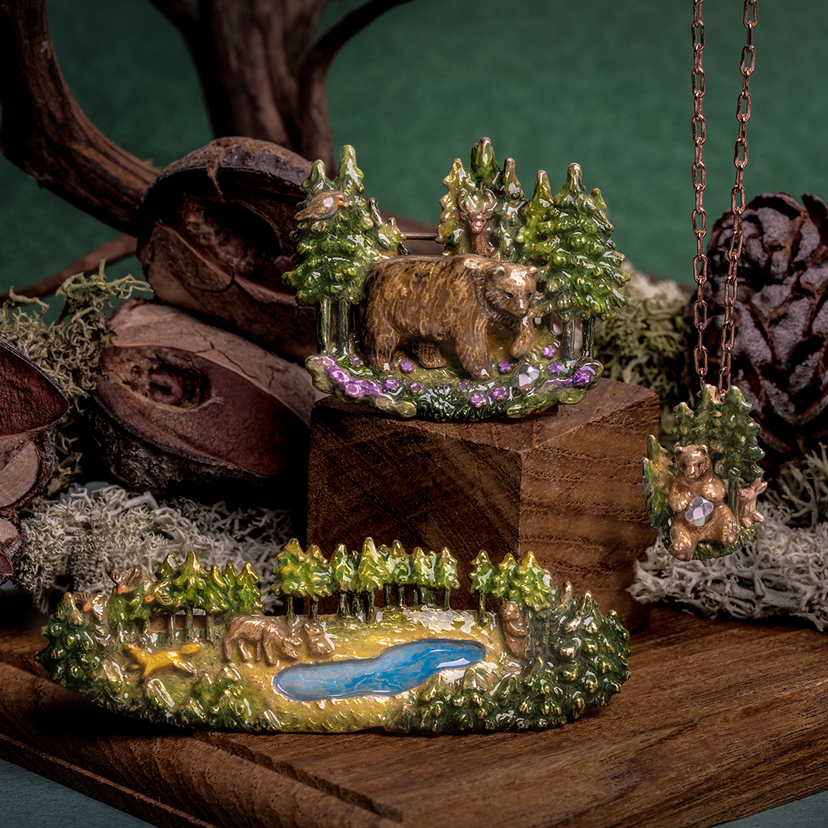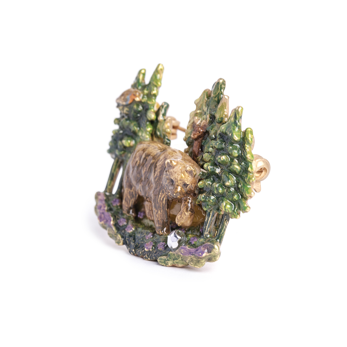 珍しい木の実を見つけたクマは、興味津々な様子で木の実をつついています。クマが見つけたものが気になるのか、ヨーロッパコマドリやシカが木々の隙間から顔をのぞかせています。そんな可愛らしいひとときをアクセサリーに仕立てました。