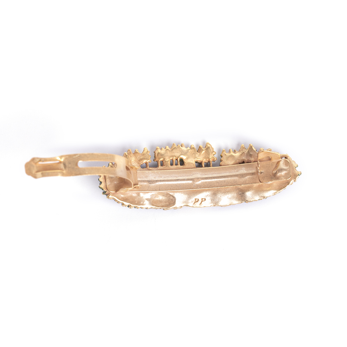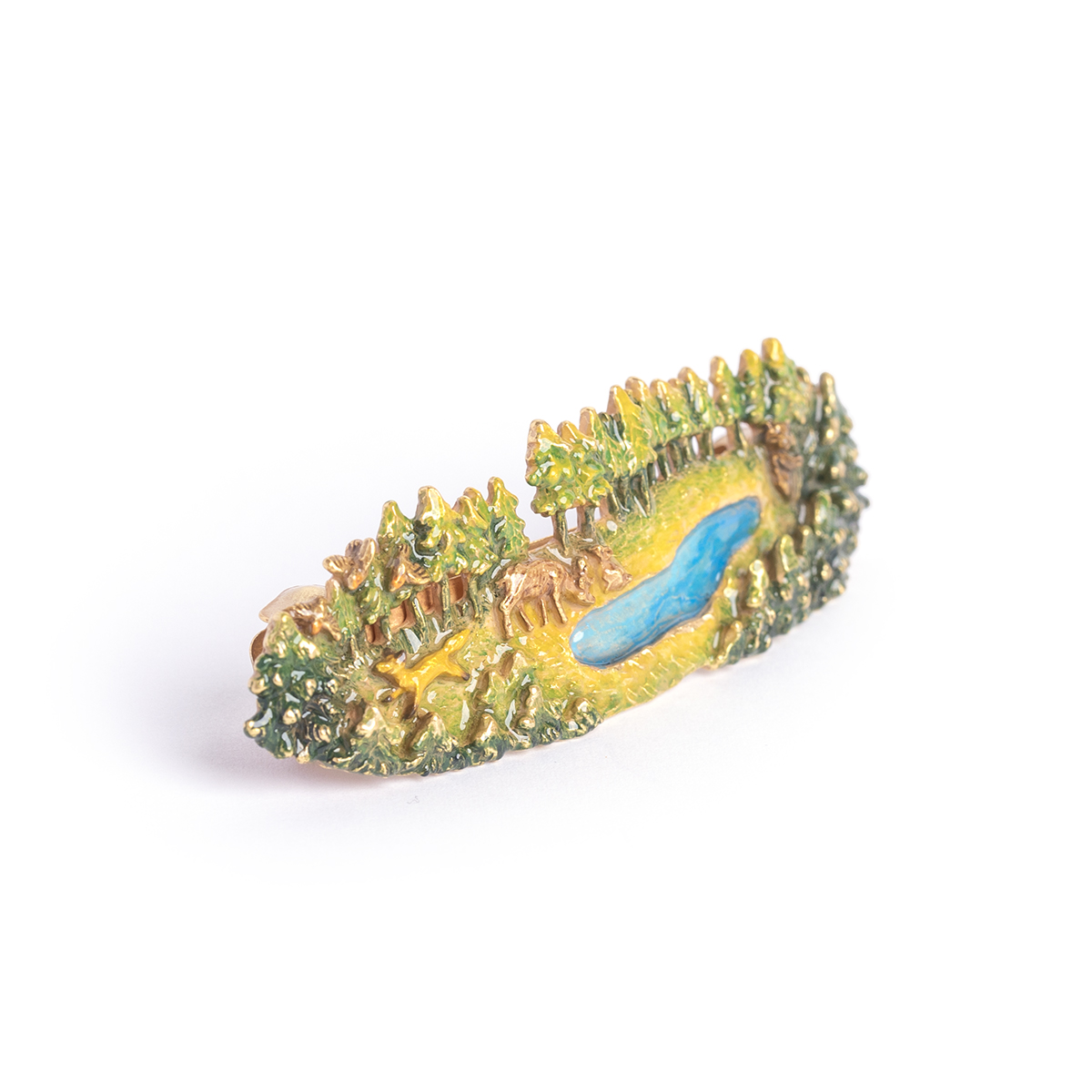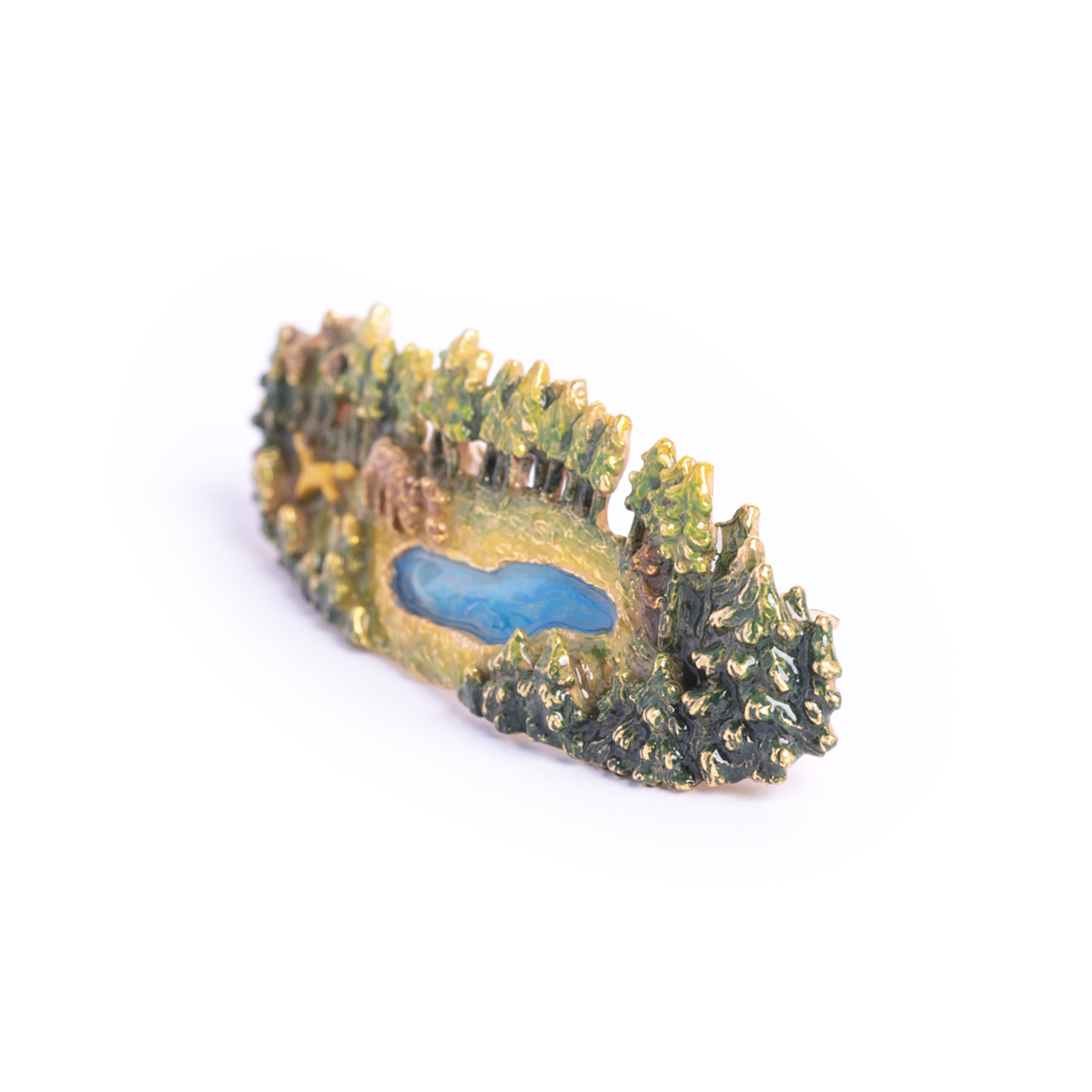 森の泉に柔らかな日差しが差し込む、穏やかな風景を描いたバレッタ。