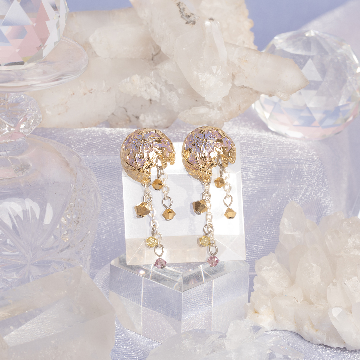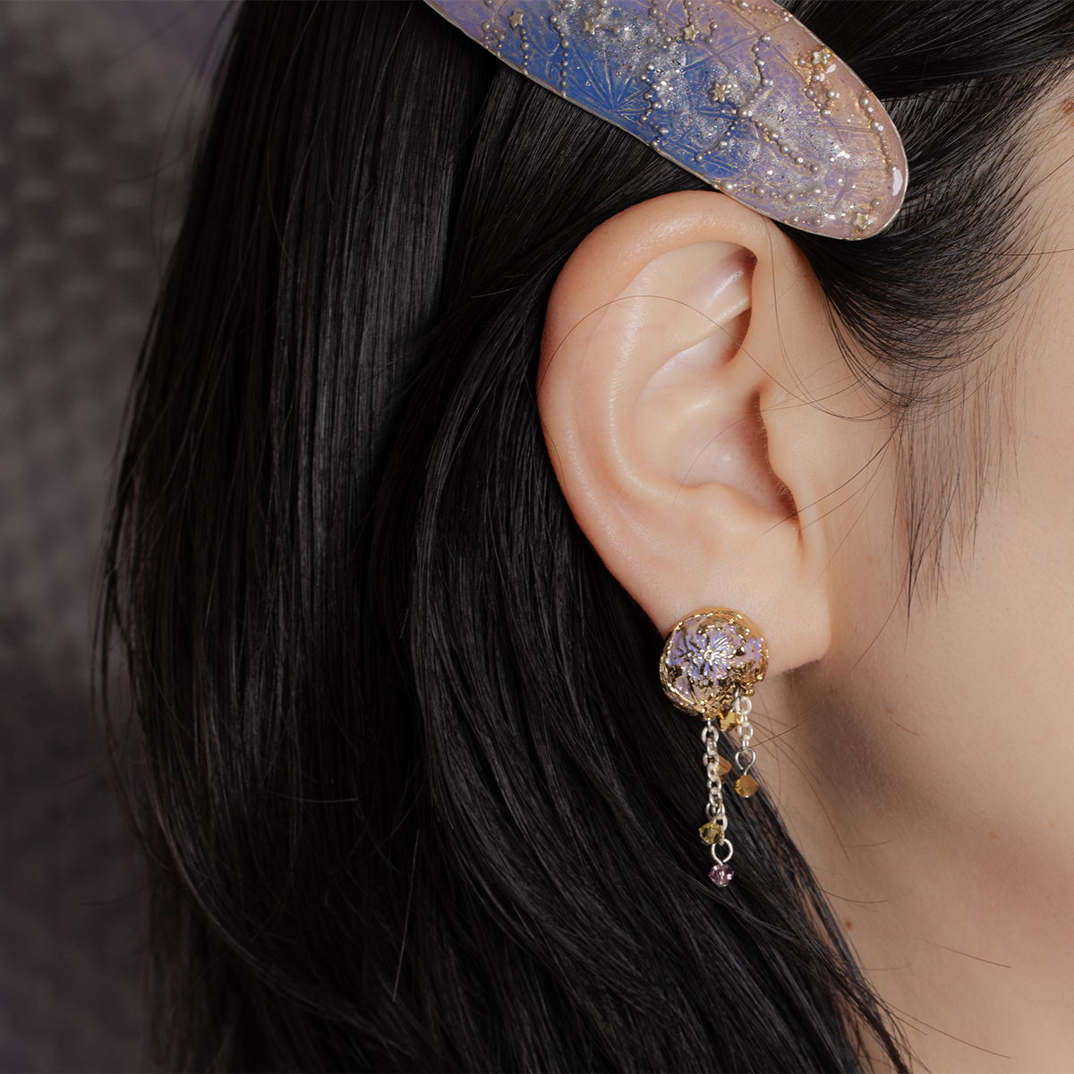 少しずつこぼれ落ちていくようにチェーンの先でゆらゆらと揺れるビーズは、月の一部であったことを主張するかのようにパープルやピンクに美しく輝いています。