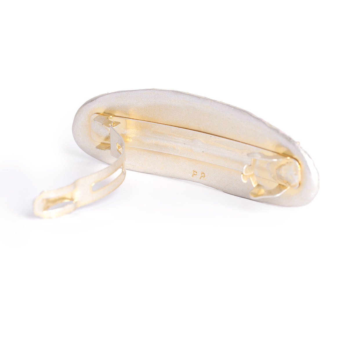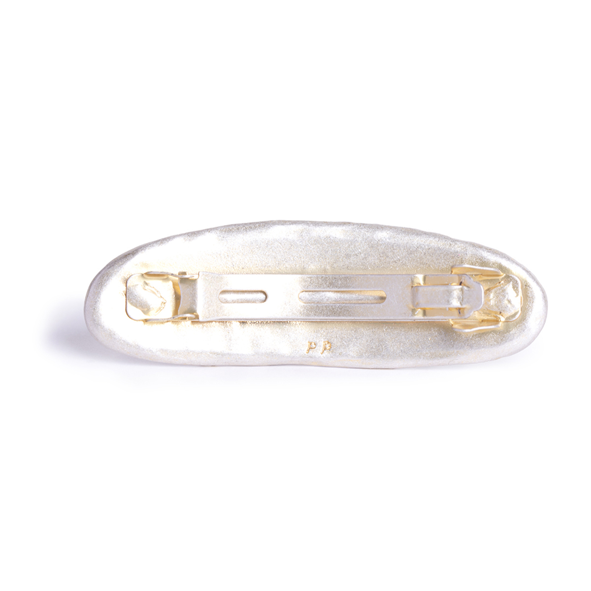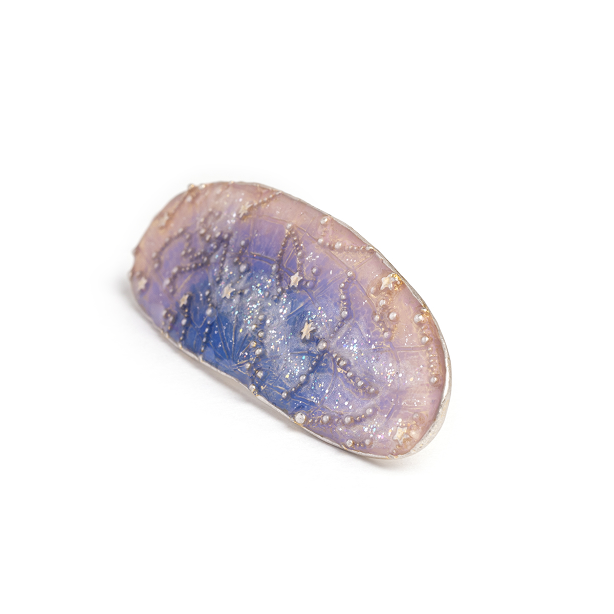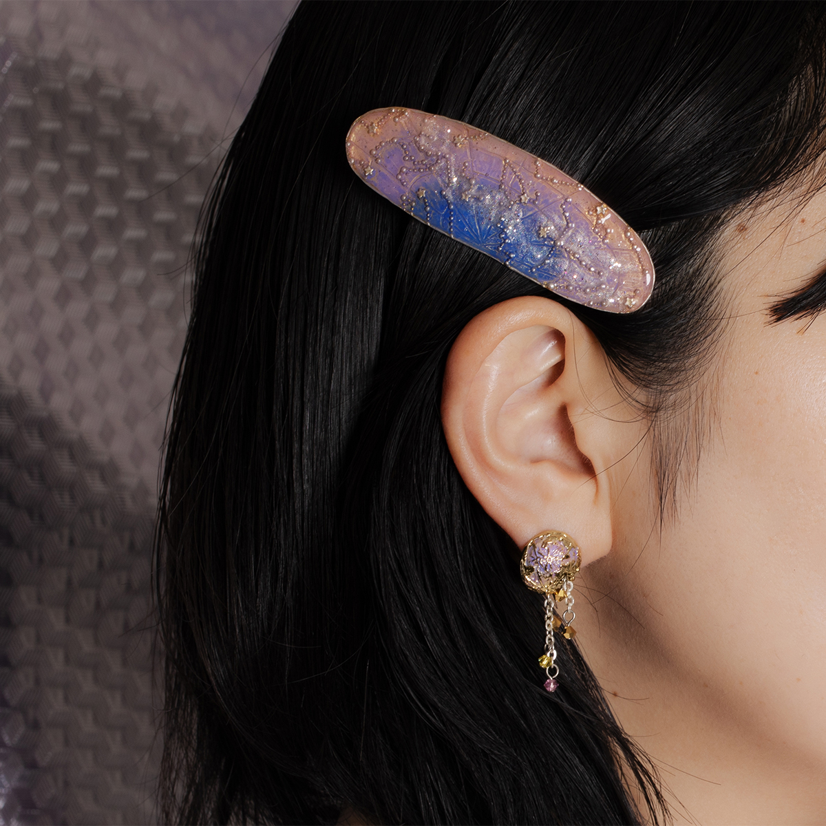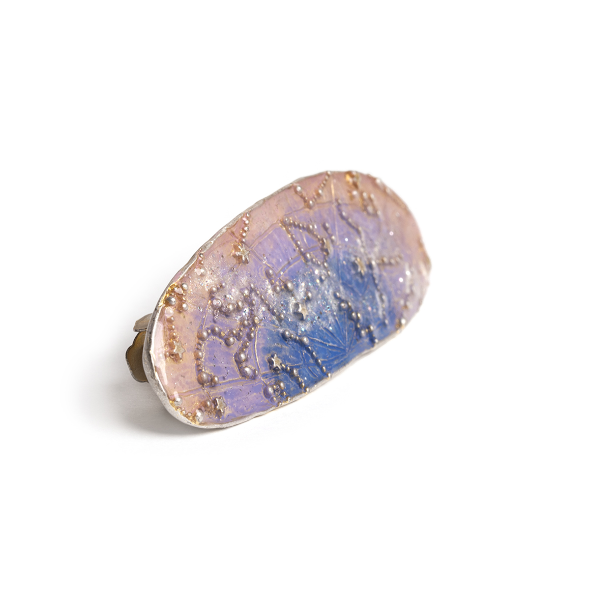プラネタリウムや天体図、天の川などのモチーフをぎゅっと詰め込んだ神秘的なバレッタ。