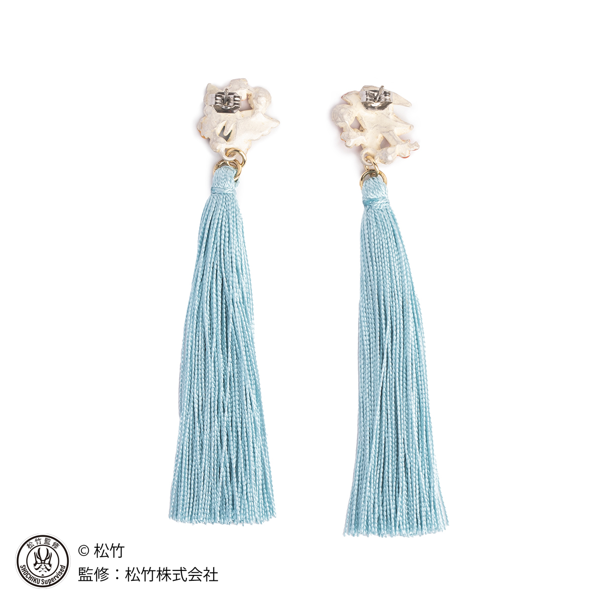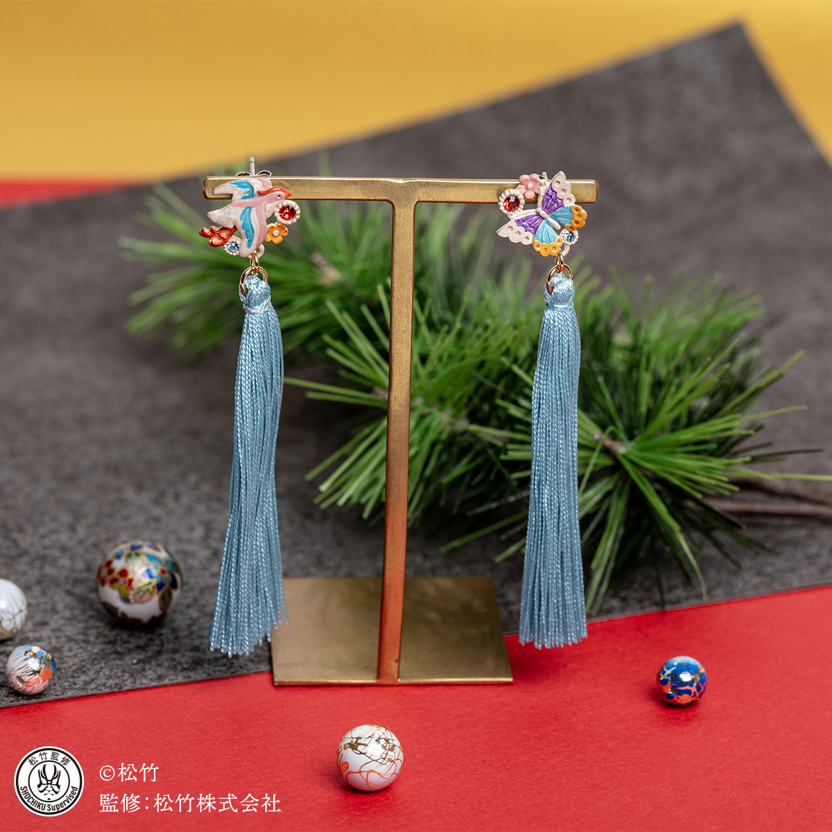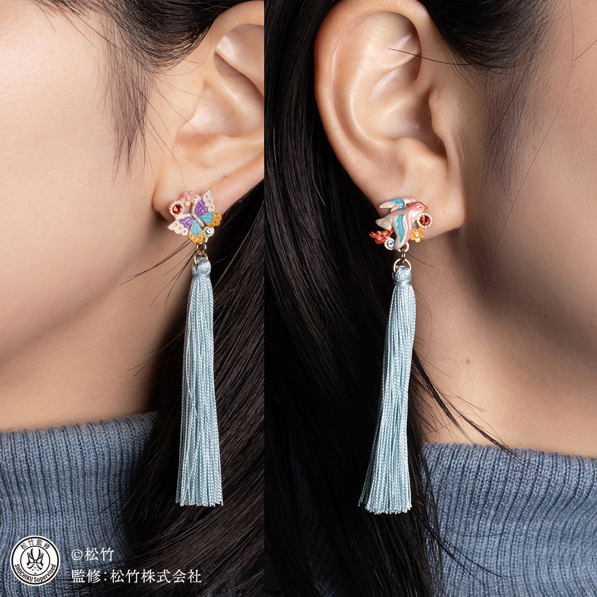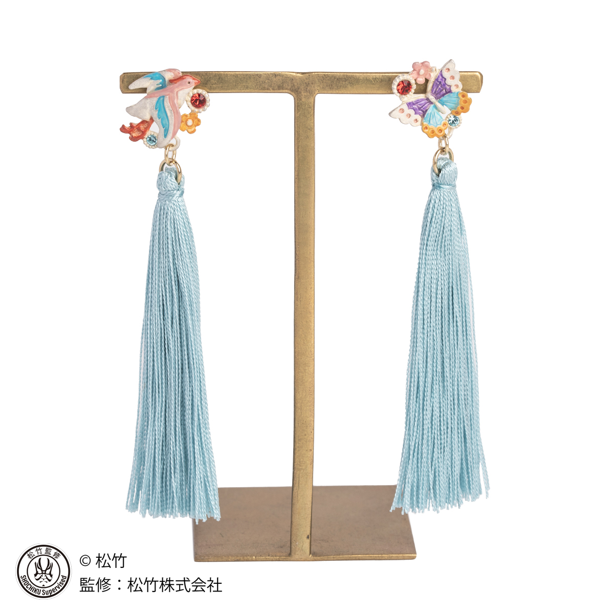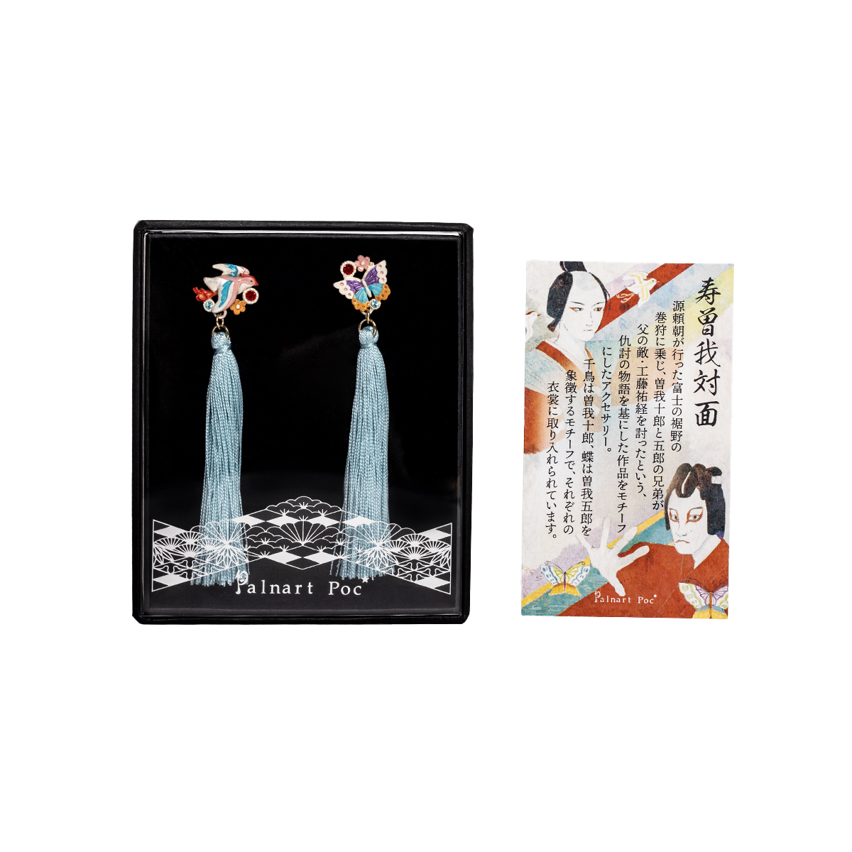 物語に登場する曽我兄弟を象徴するモチーフや色彩を取り入れた華やかなデザインのピアス。