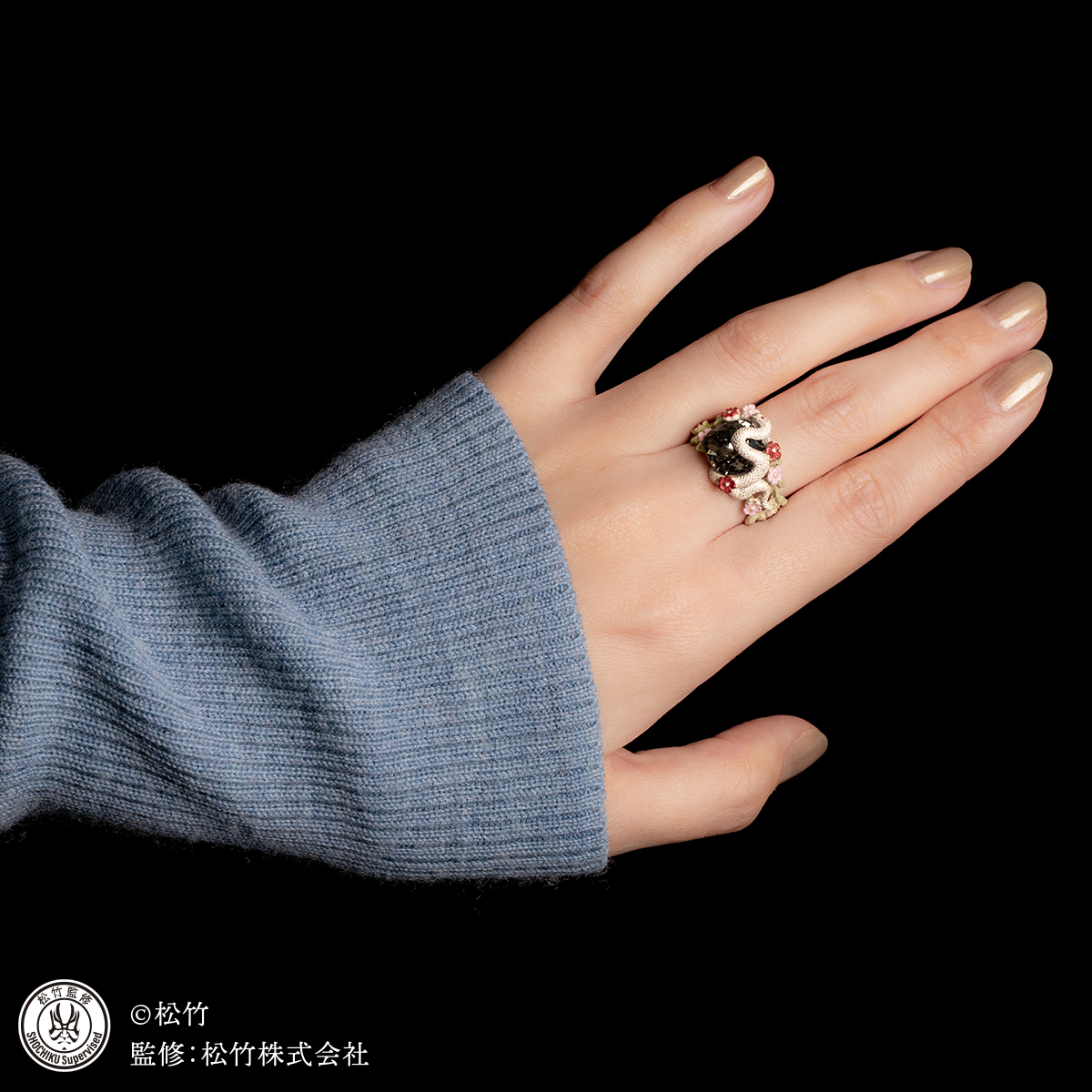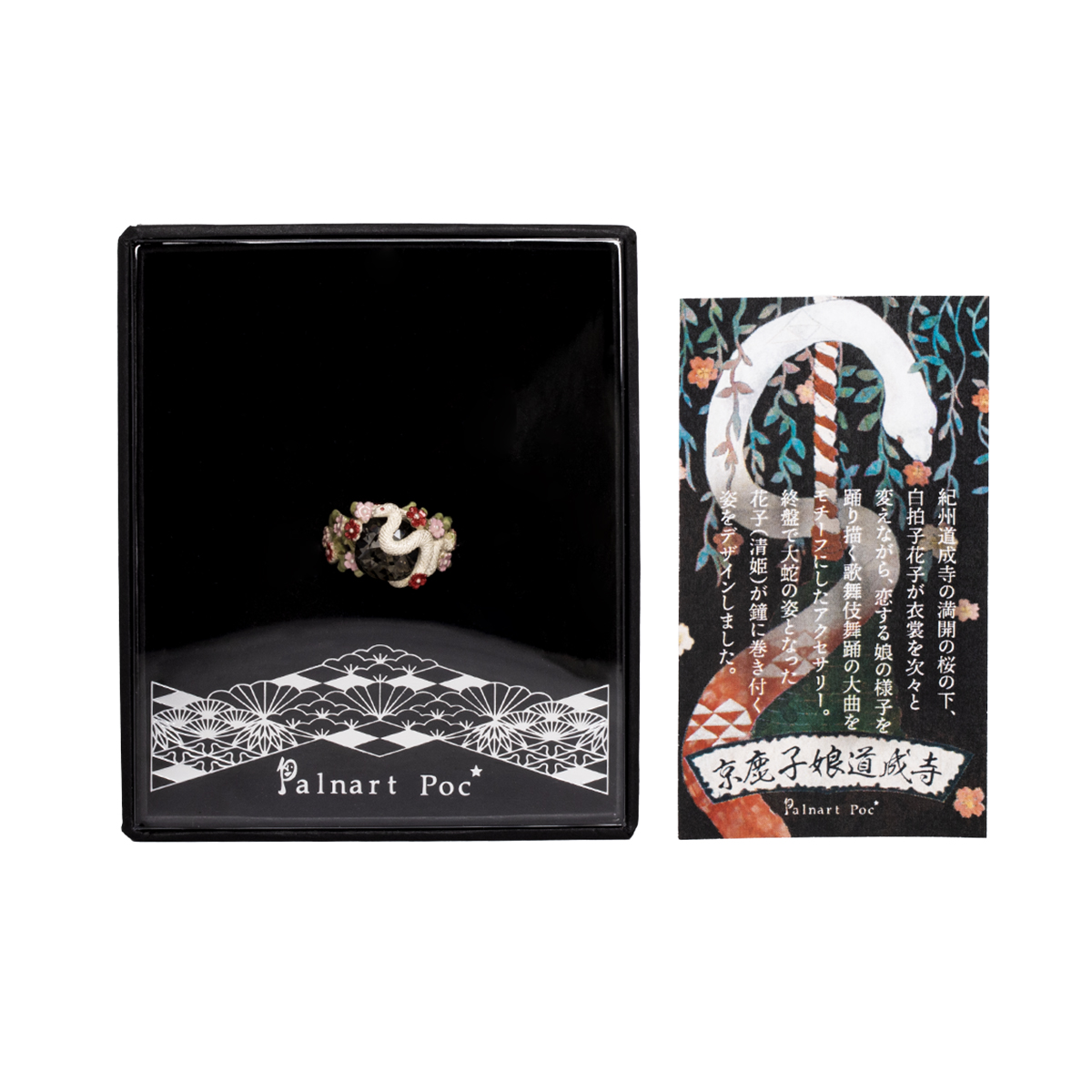 物語の終盤で、大蛇の姿となった花子(清姫)が鐘に巻き付く情景をリングで表現しました。 作中で花子が身に着けている枝垂桜の着物を思わせる、桃色と赤色の花々が華やかで美しいアイテム。美しい舞を思わせるような、白蛇の凛とした表情が印象的です。