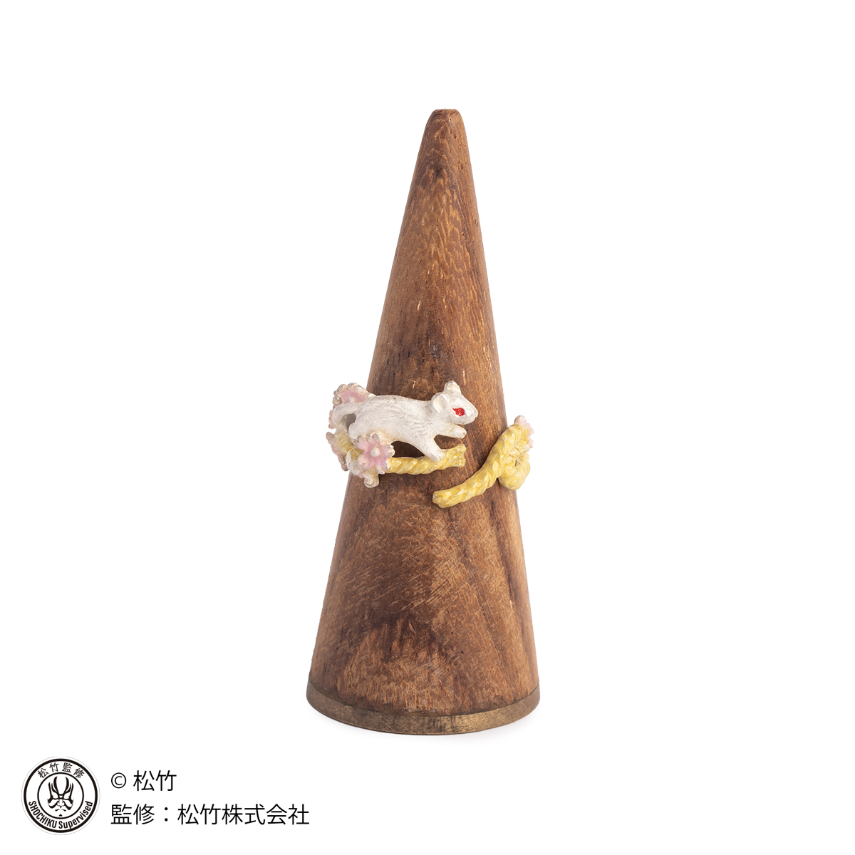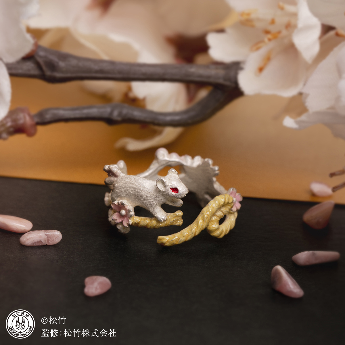 このリングは、縄でつながれた雪姫が桜の花びらを使い、爪先で描いた鼠が動き出し、縄を食いちぎって自由の身になる場面から着想を得てデザインしました。