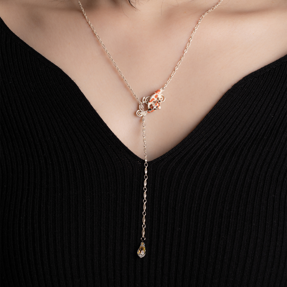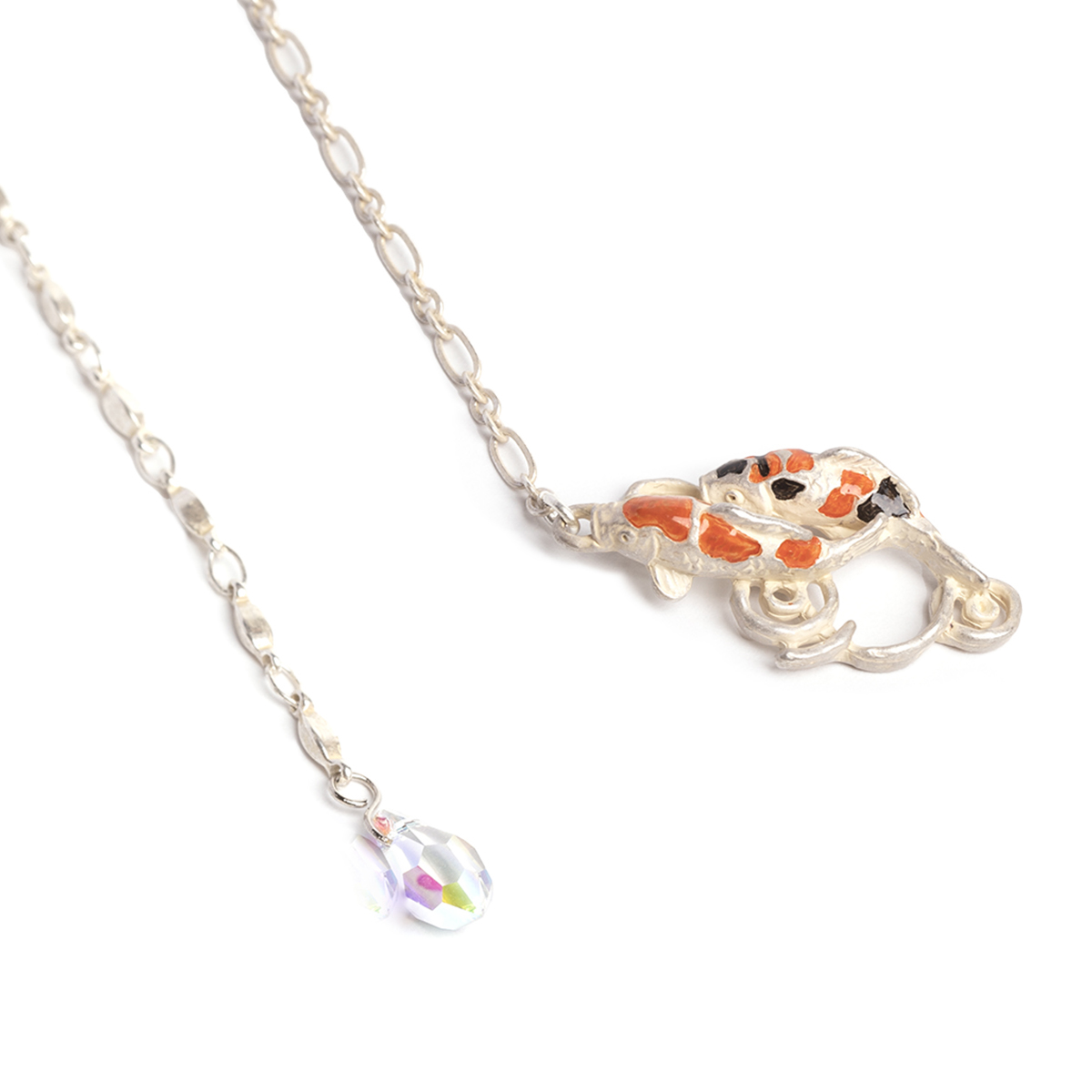 水の中を優雅に泳ぐ錦鯉がデザインされたラリエットタイプのネックレス。