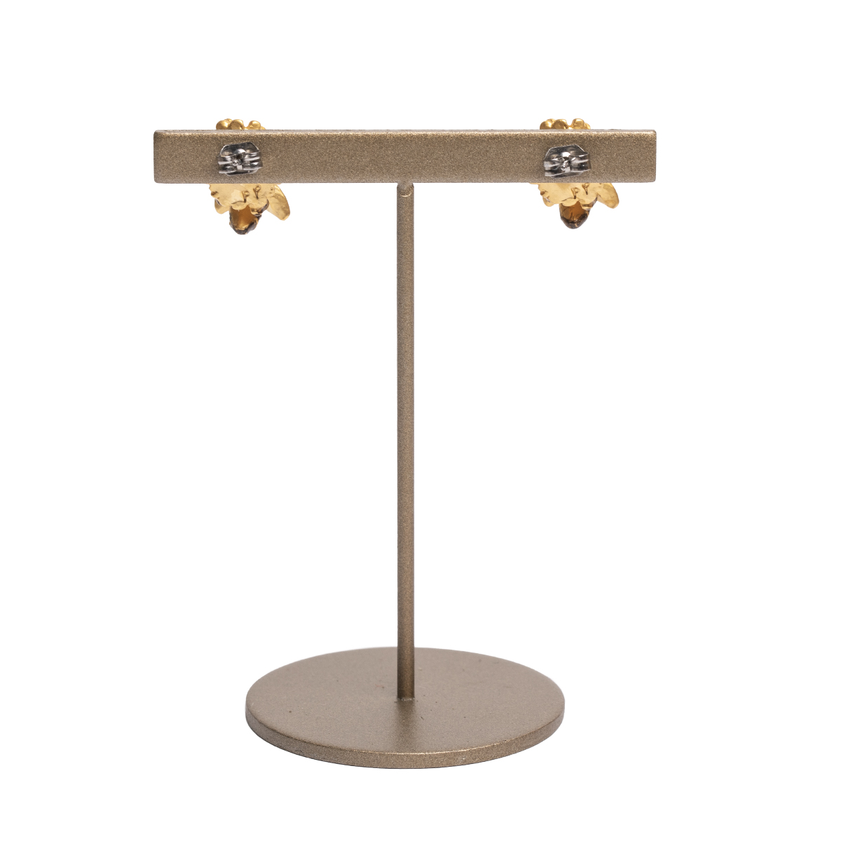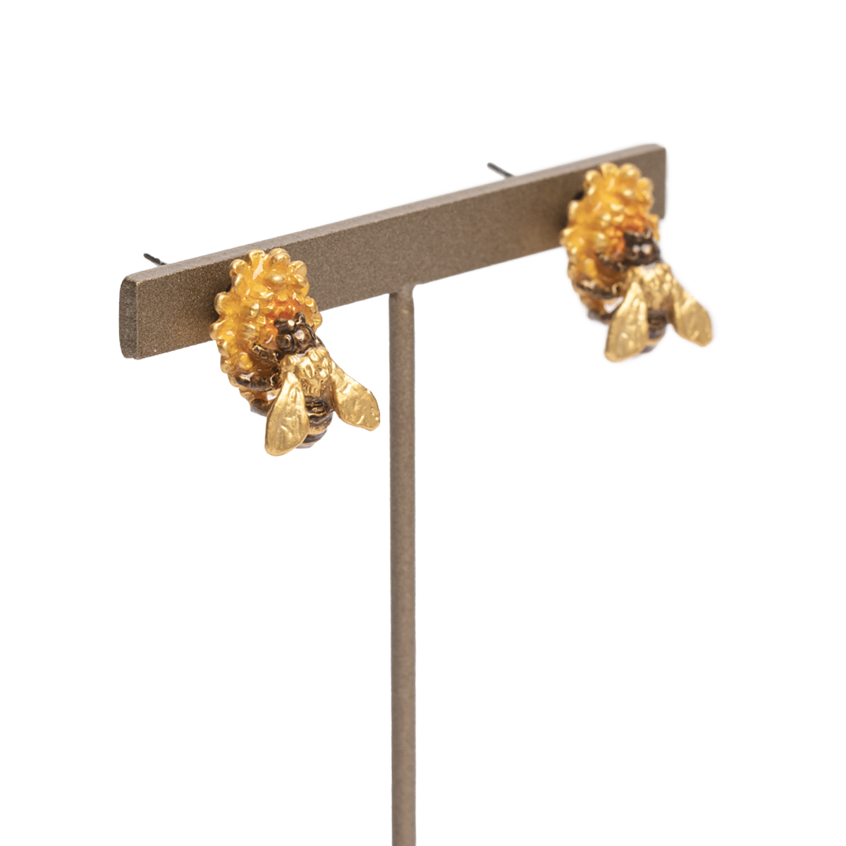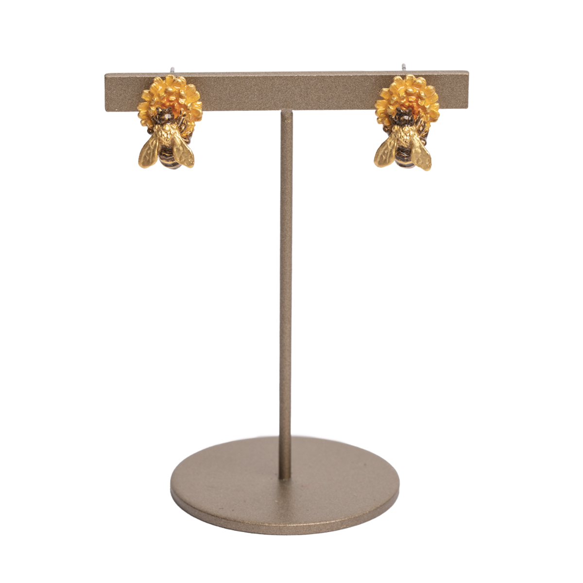 タンポポの花を見つけ、夢中で蜜や花粉を集めるミツバチをモチーフにしたピアス。