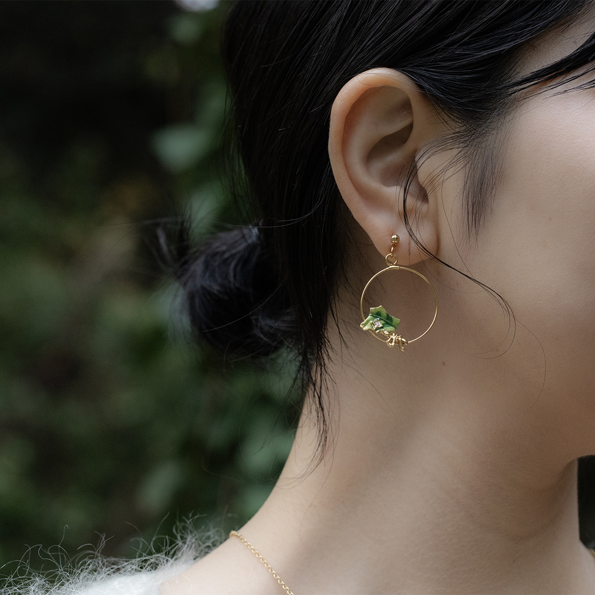 立派なあごを使い切り取った葉を、せっせと運ぶハキリアリをモチーフにしたピアス。