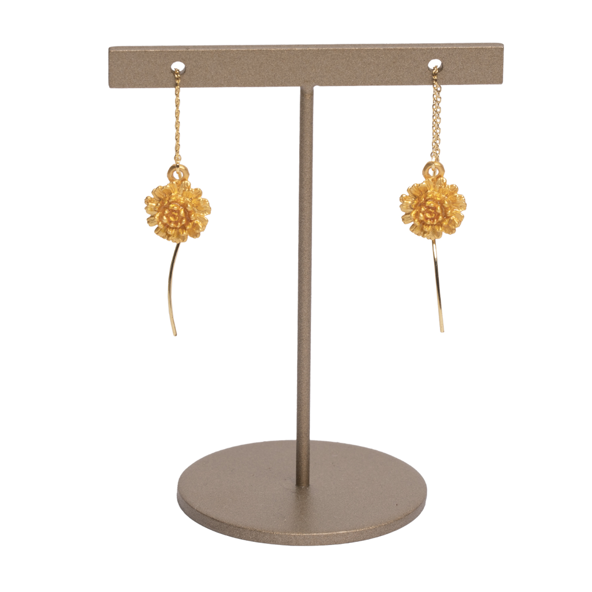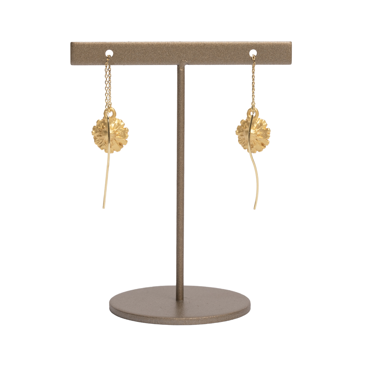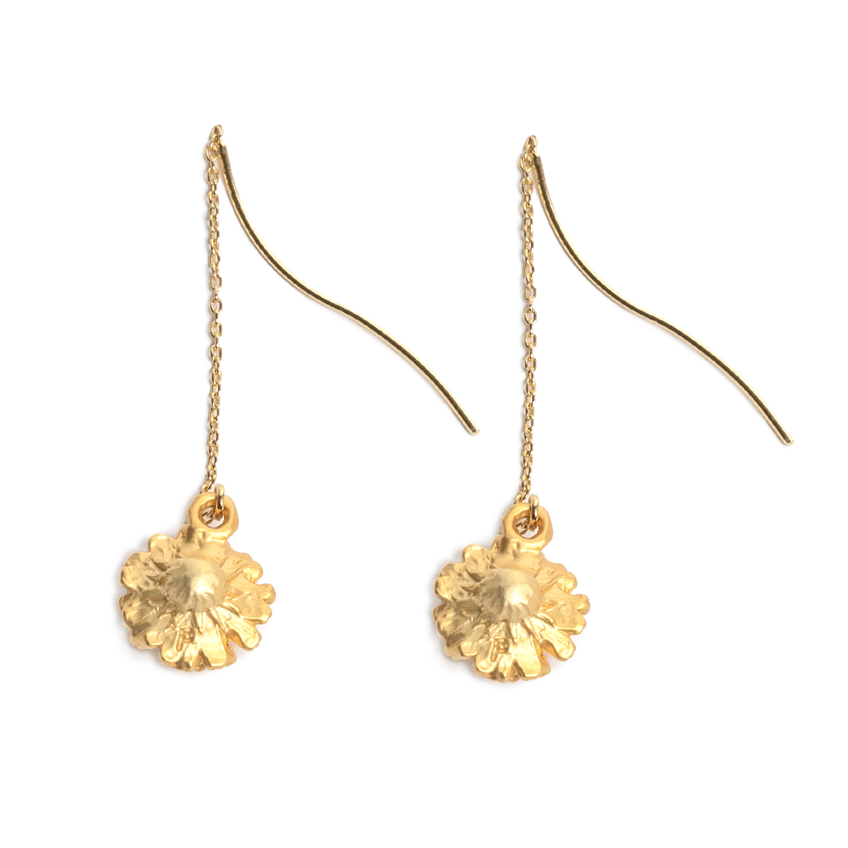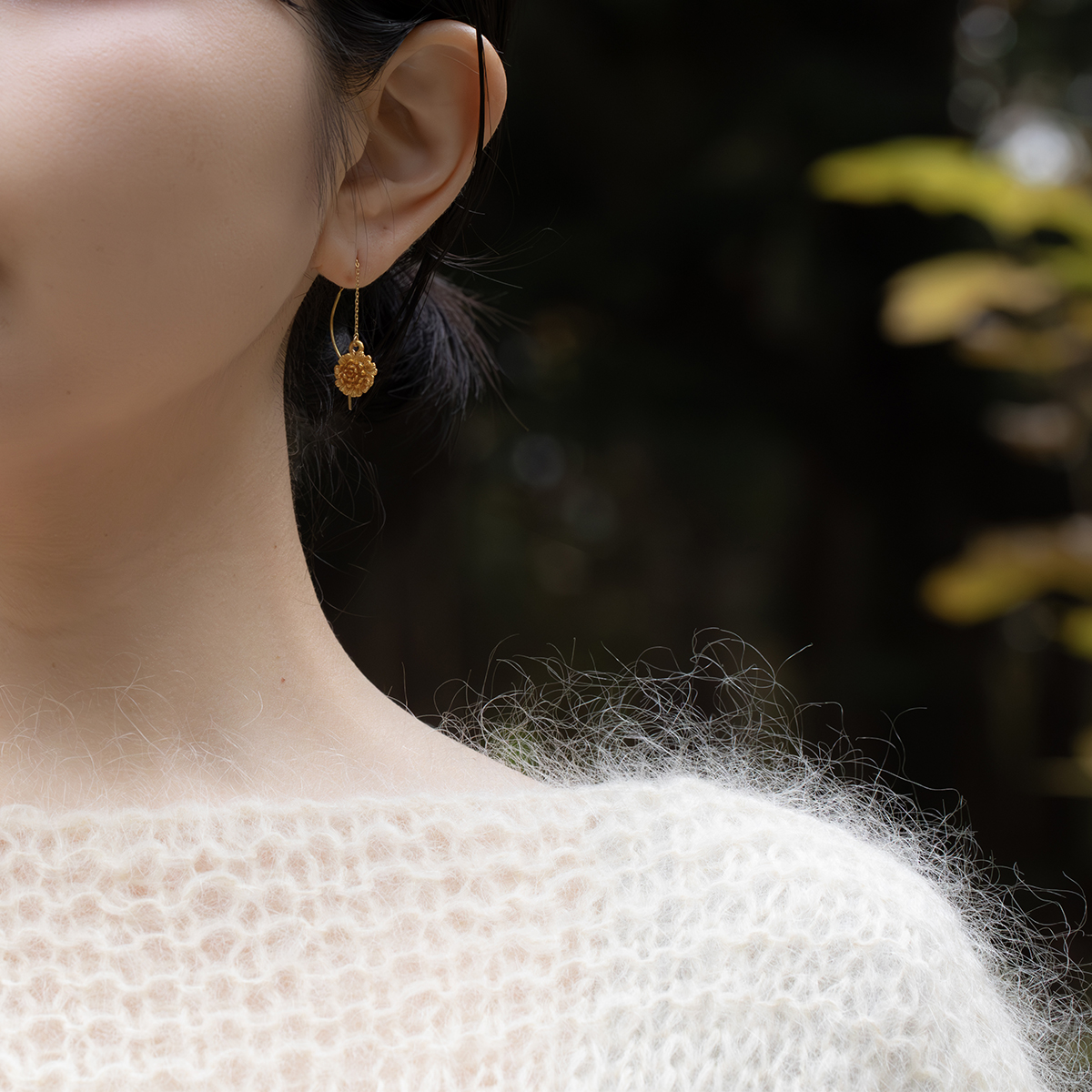 華奢なデザインながら、垂れ下がるチェーンがアクセントとなり、シンプルな装いでも耳元に印象的な表情を添えます。