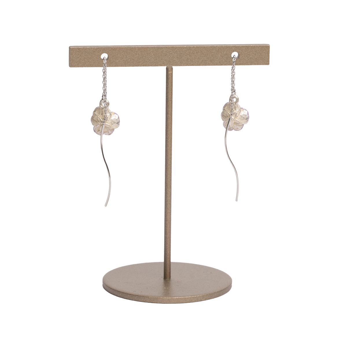 華奢なデザインでありながら、垂れ下がるチェーンがアクセントとなり、シンプルな装いでも耳元を印象的に演出します。