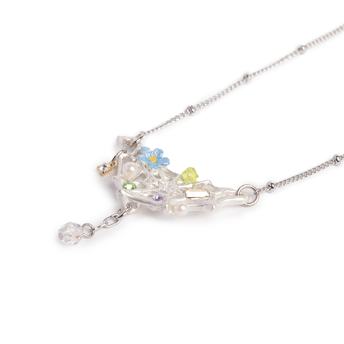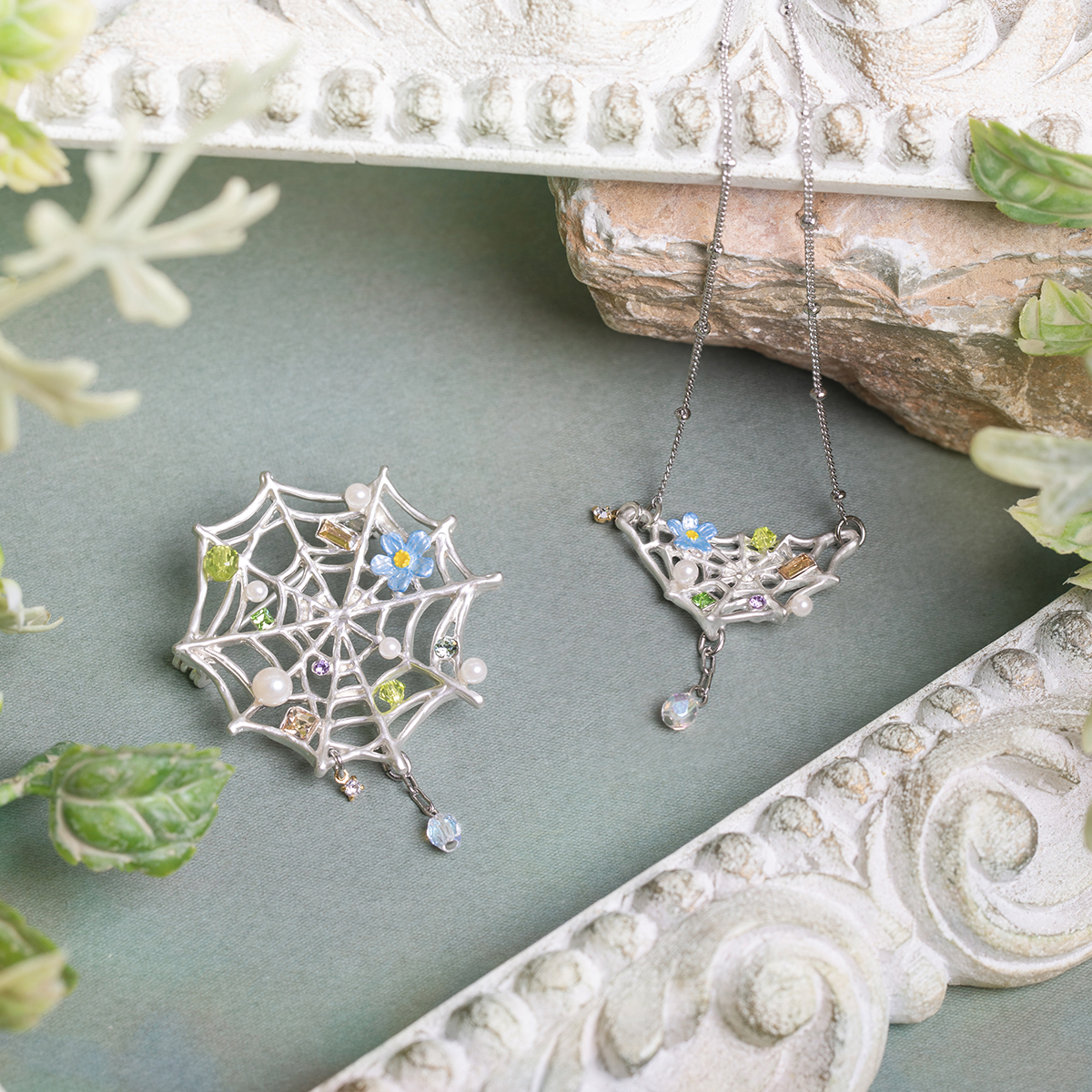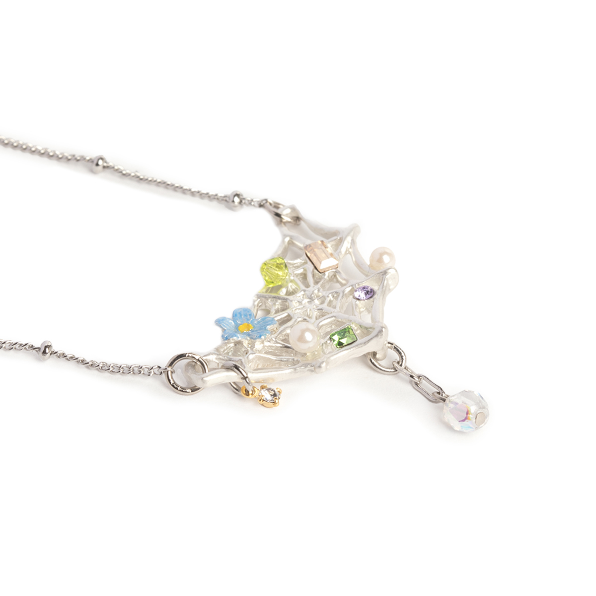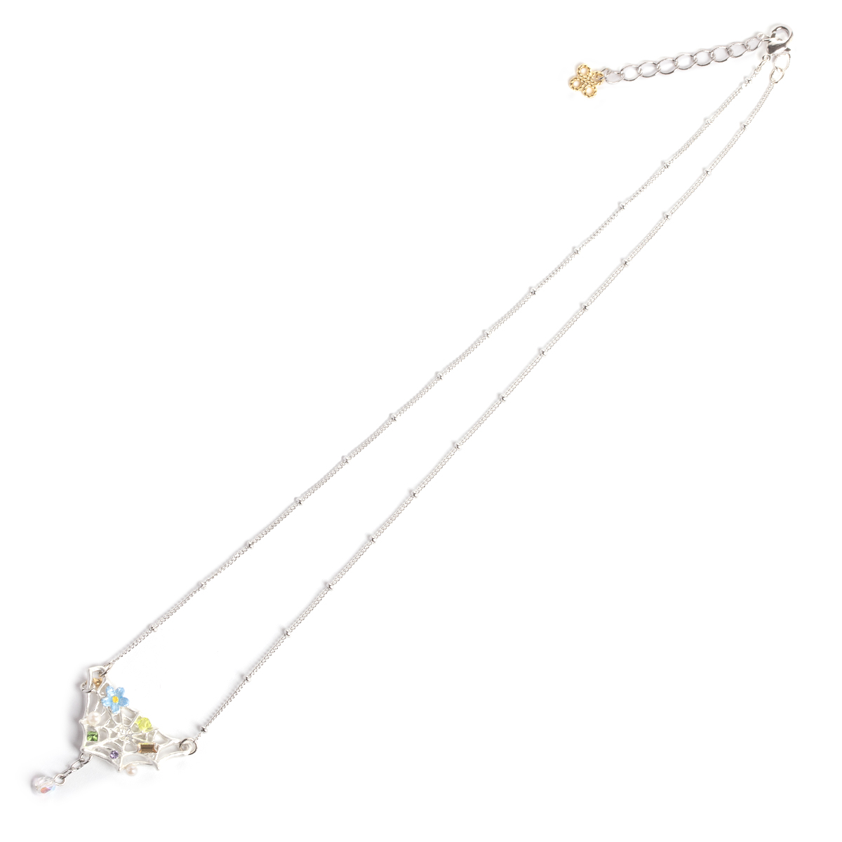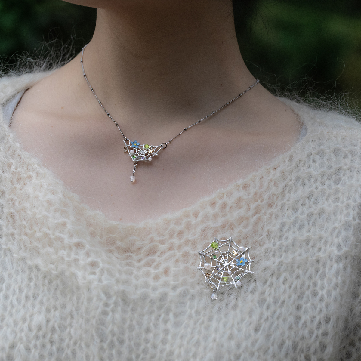 華やかに飾り付けられた、くもの巣をモチーフにしたネックレス。