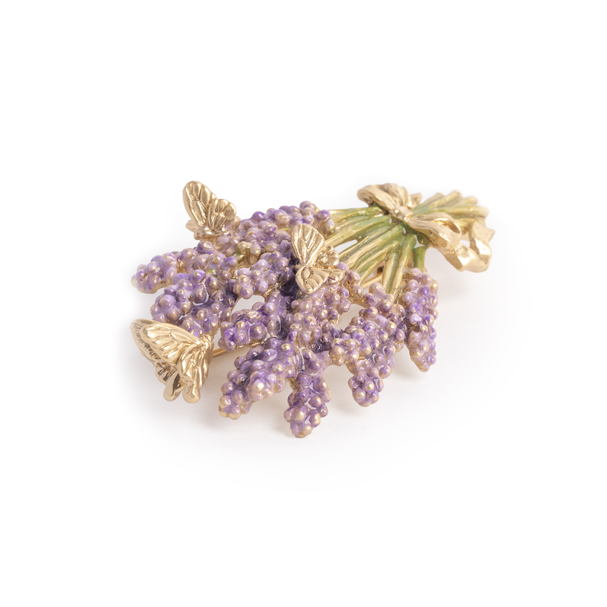 ラベンダーを束ねるリボンや、香りに誘われて舞う蝶たちは、落ち着きのあるマットゴールドで仕上げました。
