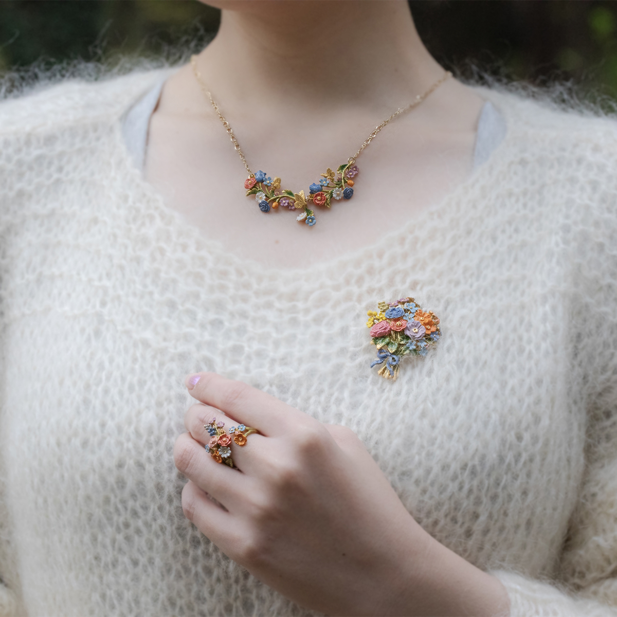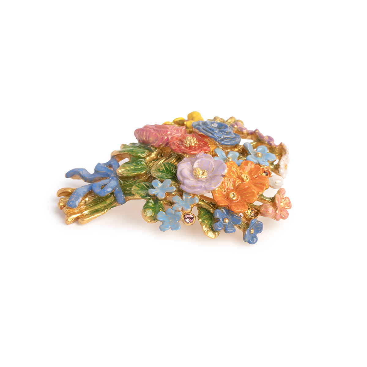 色とりどりの花々が咲き誇る庭の情景をブーケに仕立て、ブルーのリボンで束ねた華やかなブローチ。
