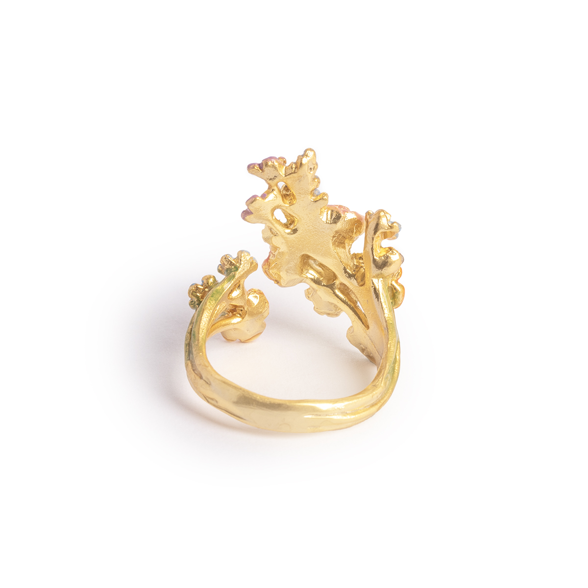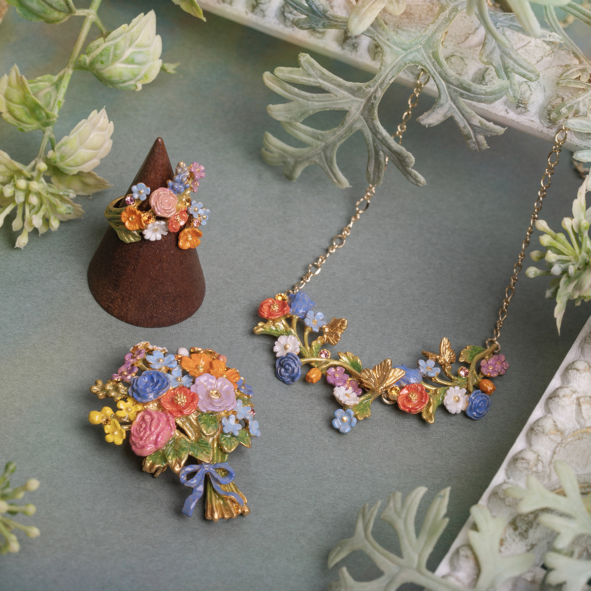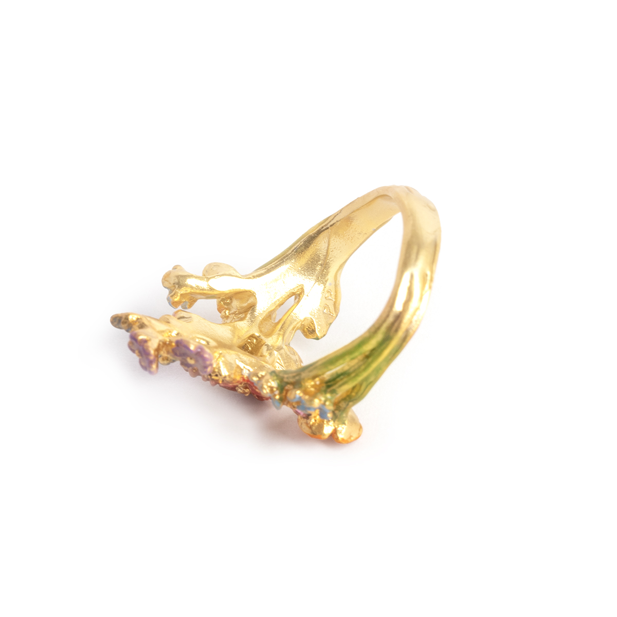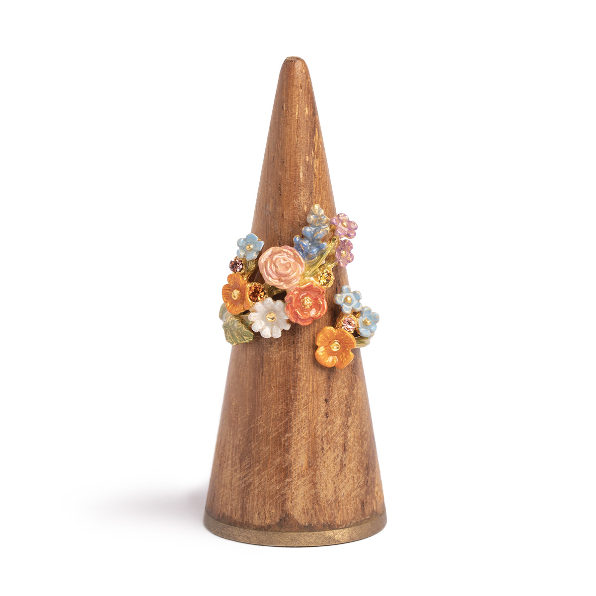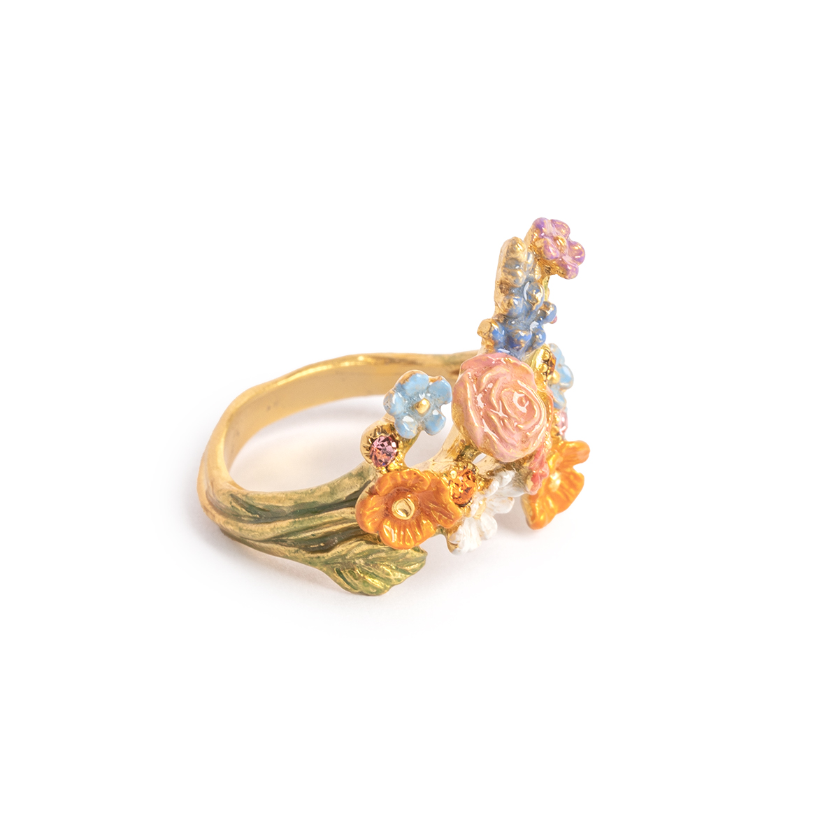 指先に色とりどりの花々が咲き誇る、小さな庭を思わせるリング。