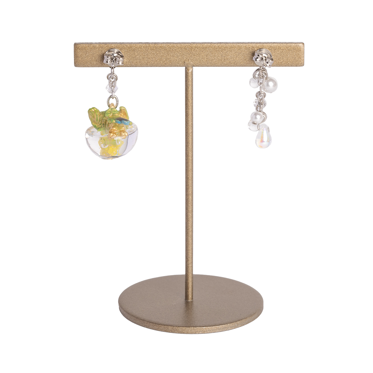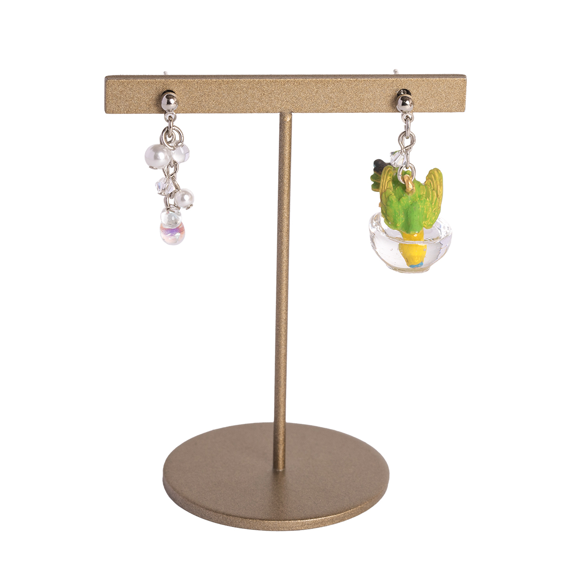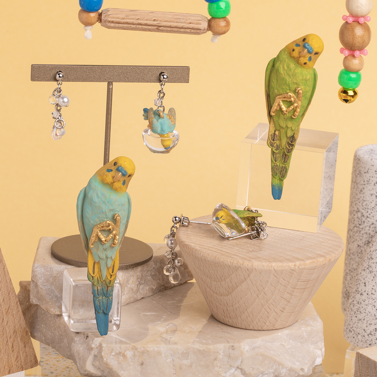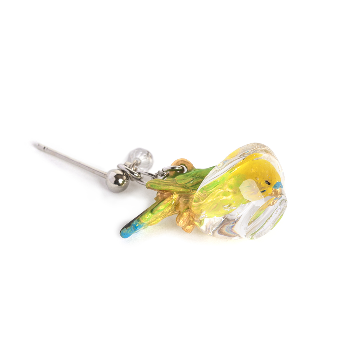 もう片方のピアスには、水しぶきをイメージしたビーズがキラキラと揺れ、豪快に水浴びするセキセイインコの姿を際立たせます。