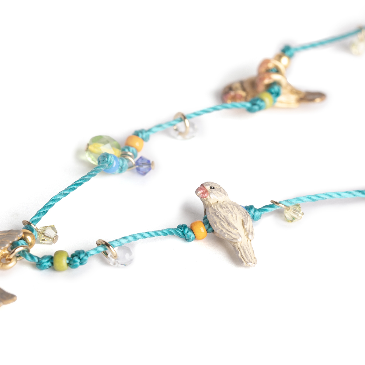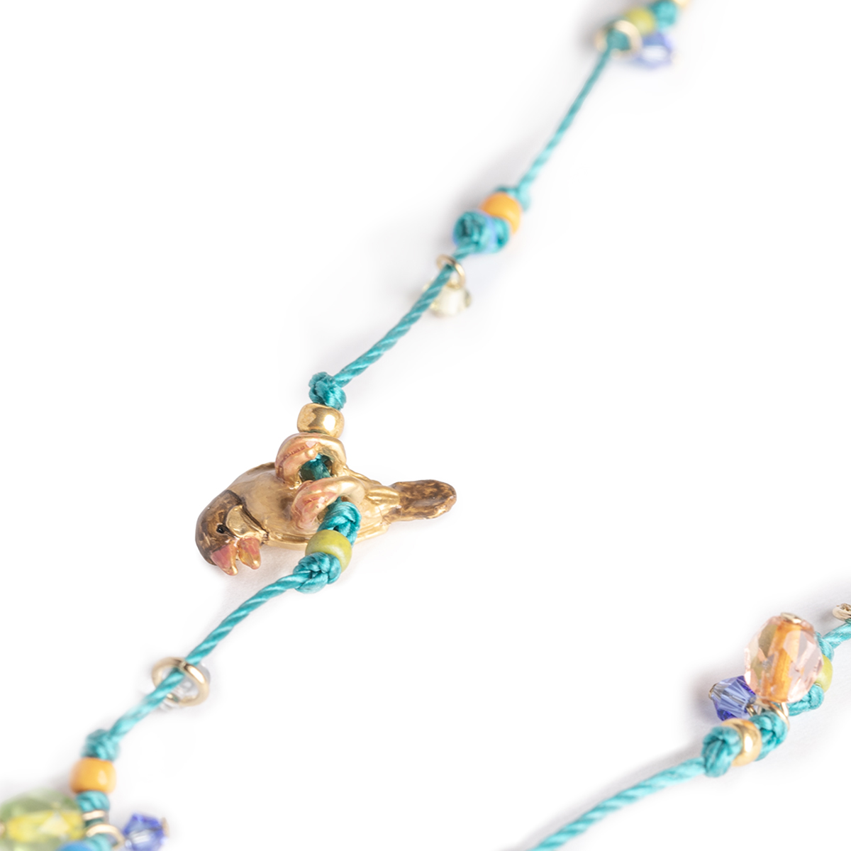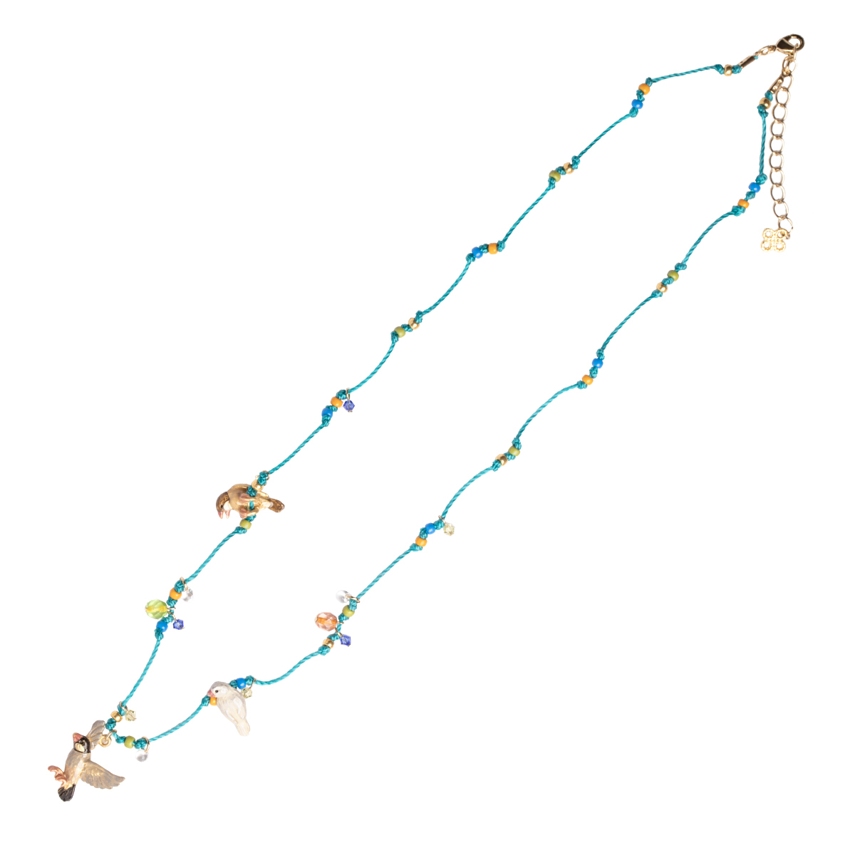 モチーフの文鳥たちは小ぶりながら細部まで丁寧に造形され、一羽ずつじっくり眺めたくなる仕上がりに。 鮮やかなターコイズブルーのコードに、オレンジやグリーンなど色とりどりのビーズを飾り、さわやかでポップな印象にまとめました。