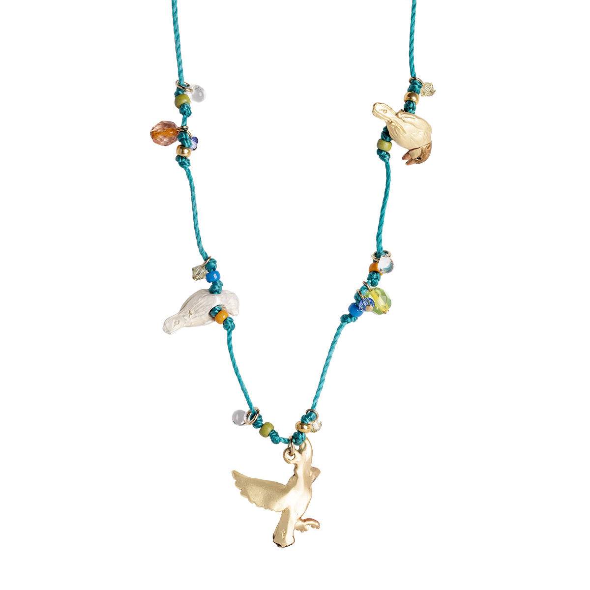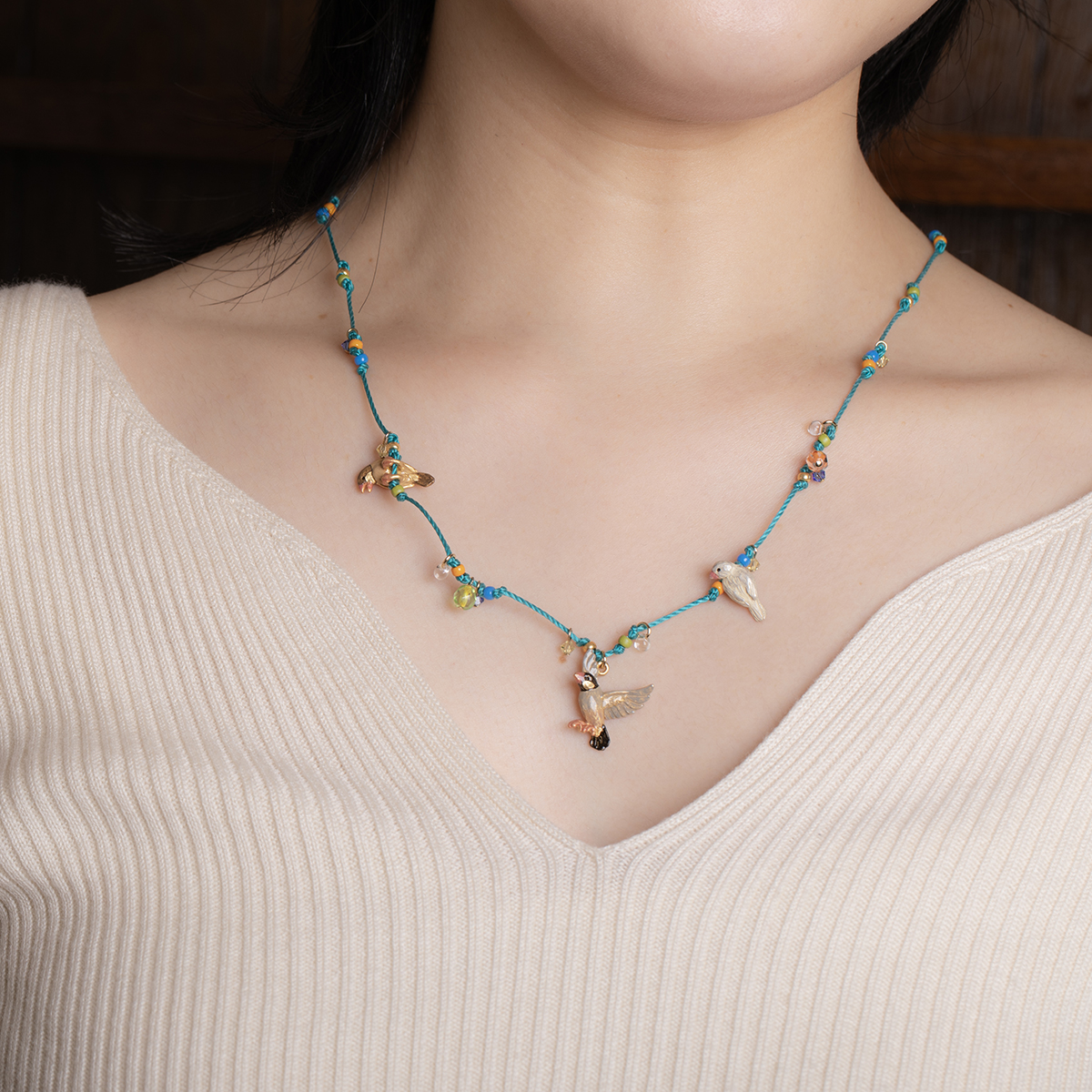 鳥かごから出て、気ままに過ごす文鳥たちをモチーフにしたネックレス。