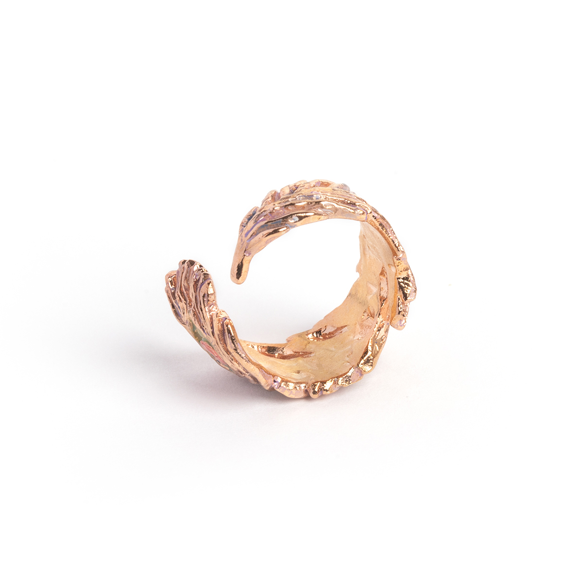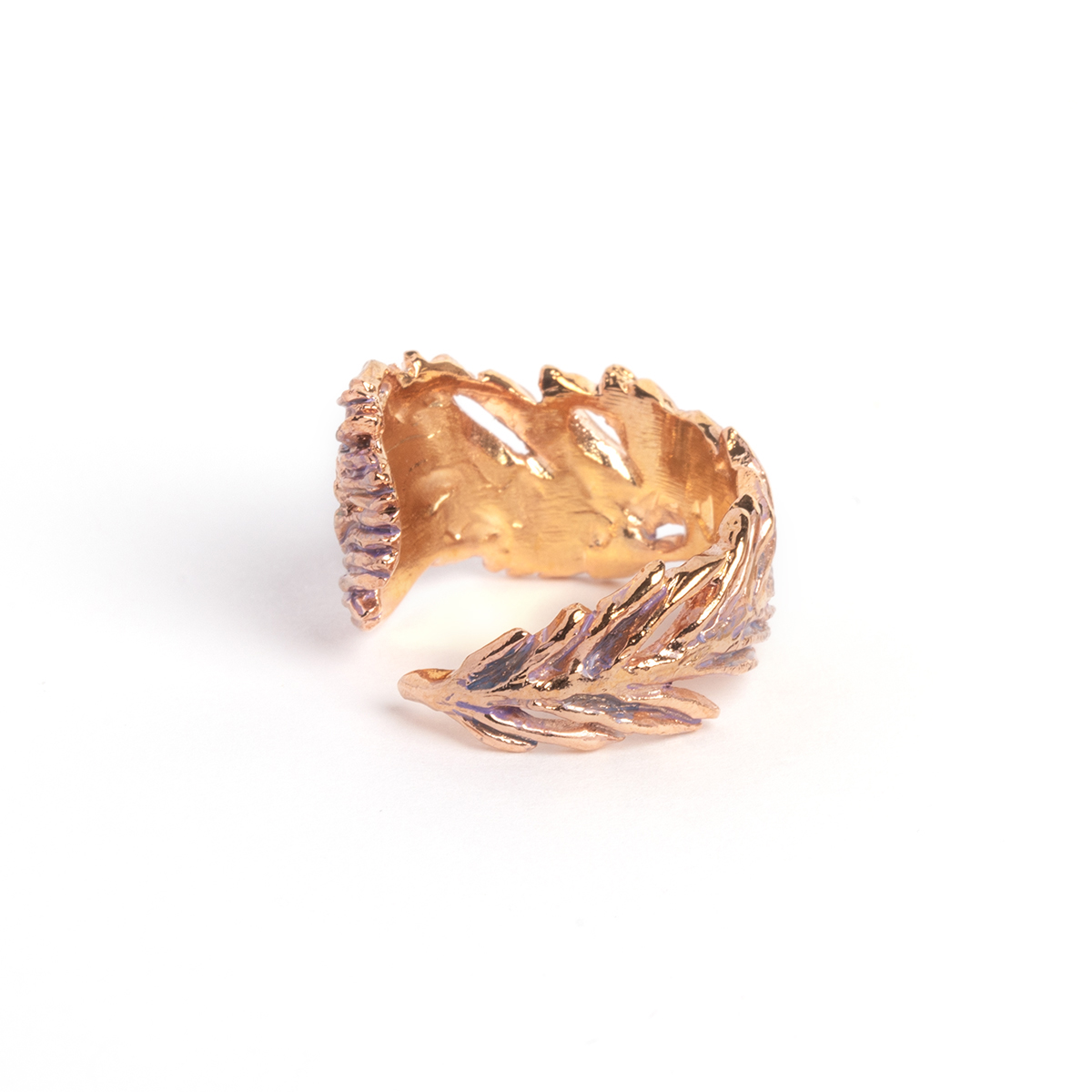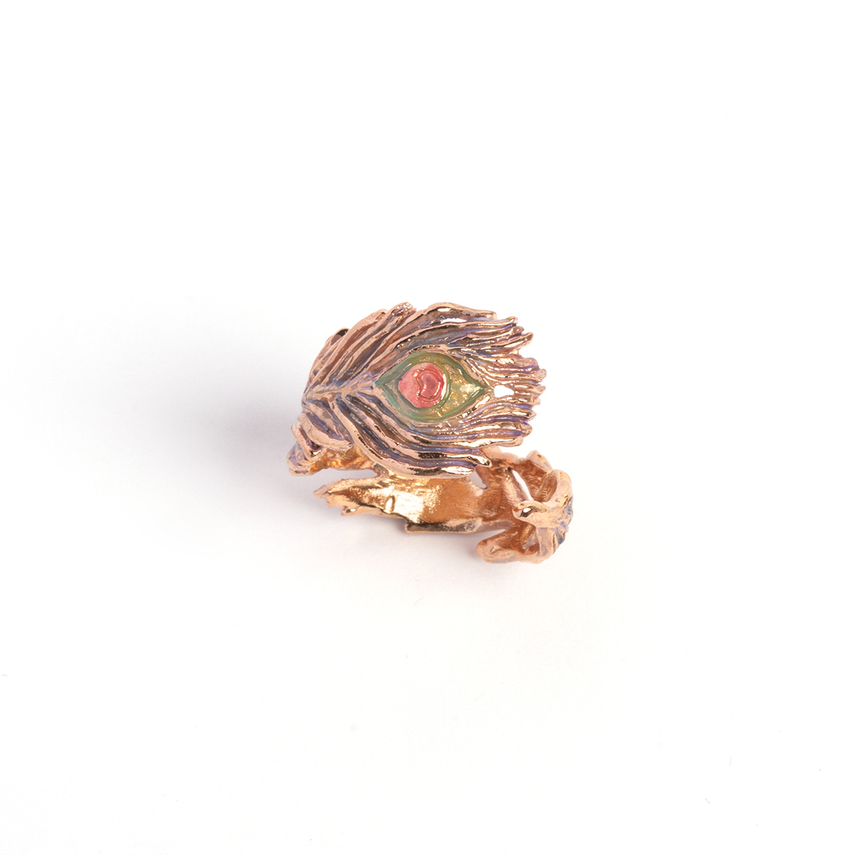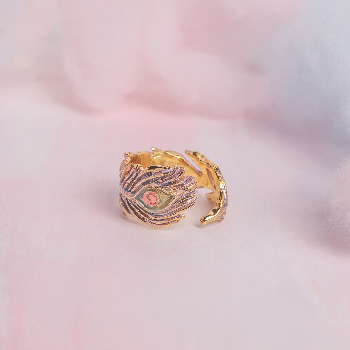 優雅な印象を与える孔雀の羽根のリング。 ふわりとした柔らかな羽根の雰囲気を際立たせる繊細な造形が美しいアイテムです。 ピンクゴールドをベースに優しいニュアンスカラーを重ね、華やかで奥行きのある仕上がりに。