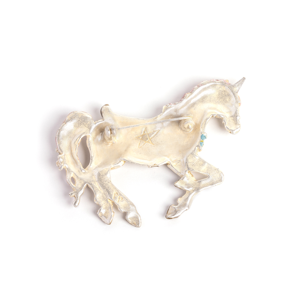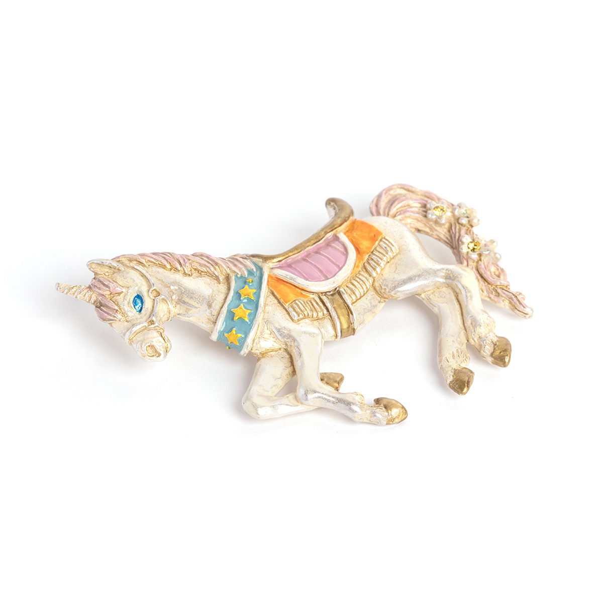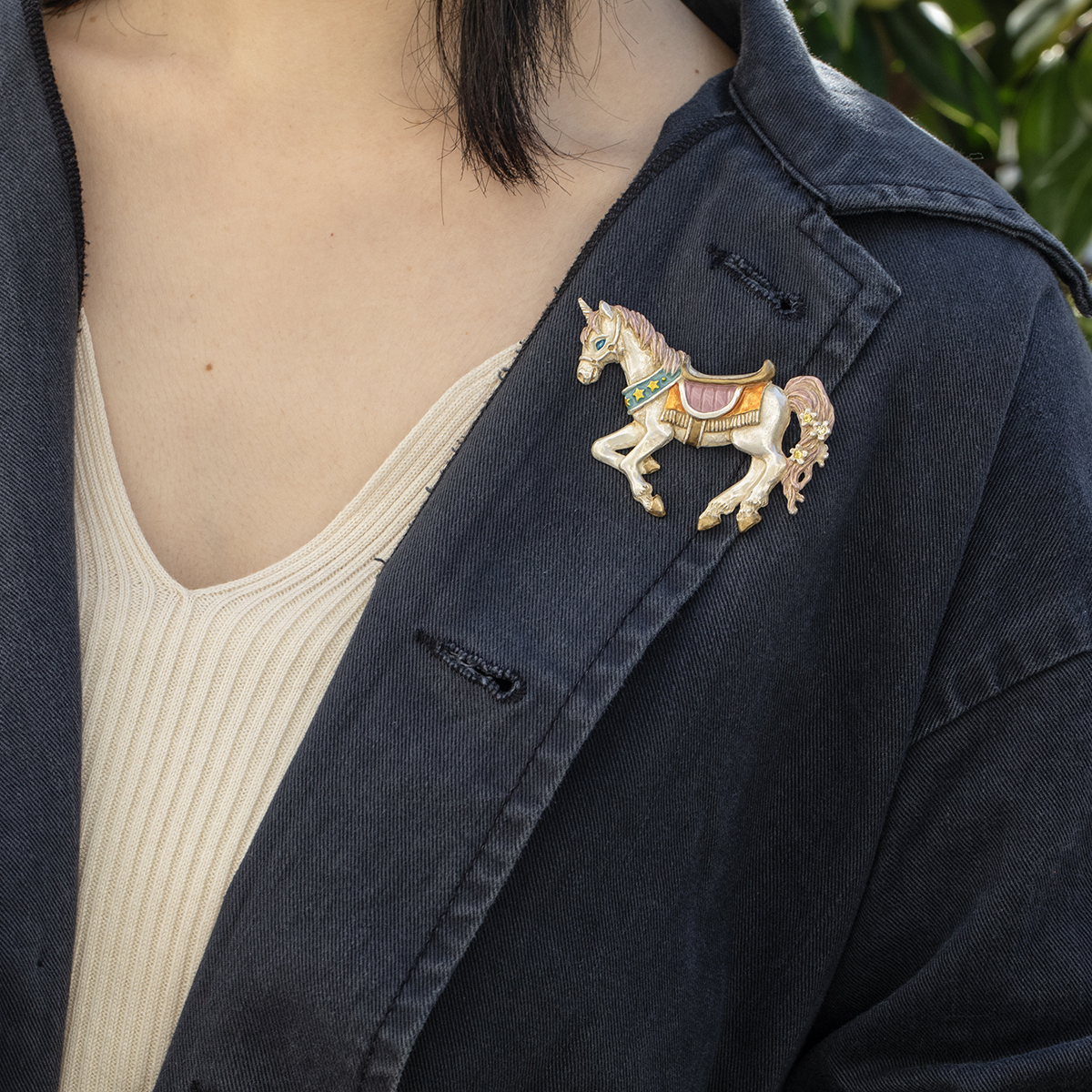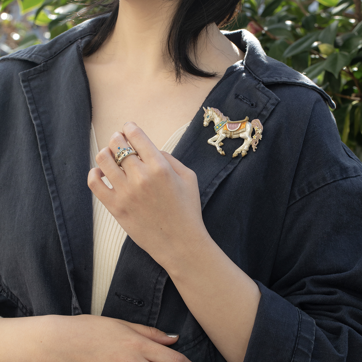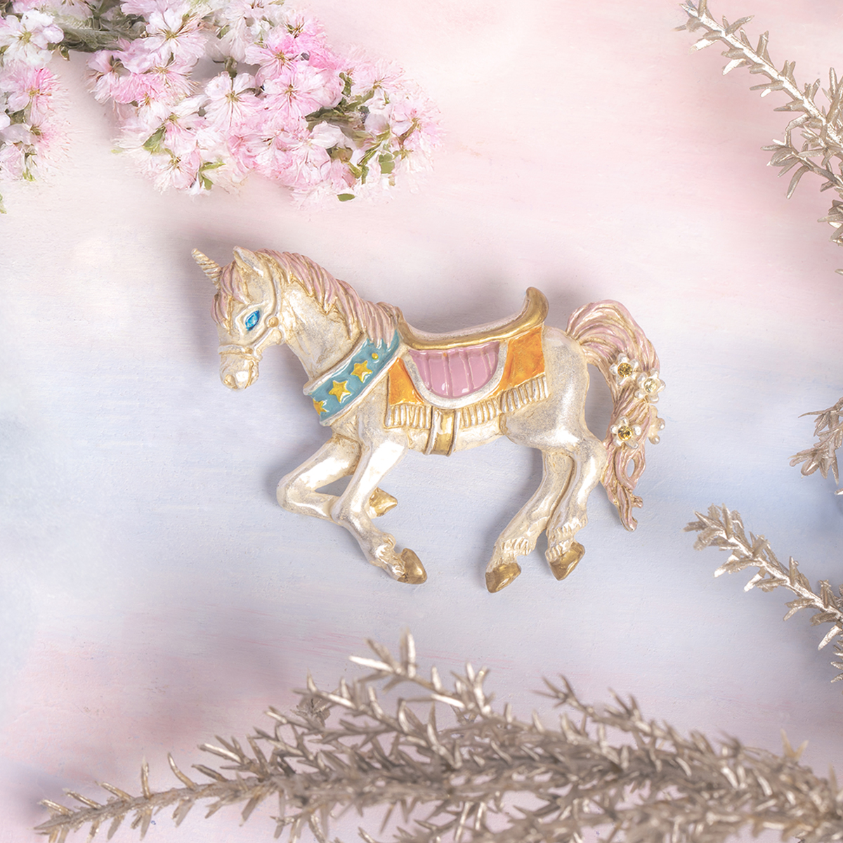 真っ白な体にピンクのたてがみが愛らしいユニコーンのブローチ。 澄んだ青い瞳が印象的で、背中に誰かを乗せる使命を思わせる凛とした表情が魅力です。 トロットのリズムに合わせてふわふわと動いている様子のしっぽは、お花で飾られ可愛らしさを演出します。