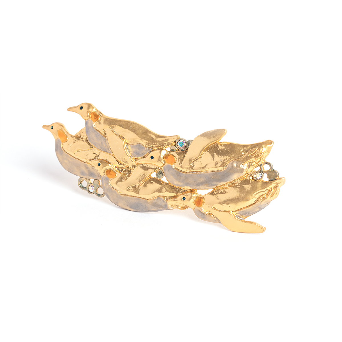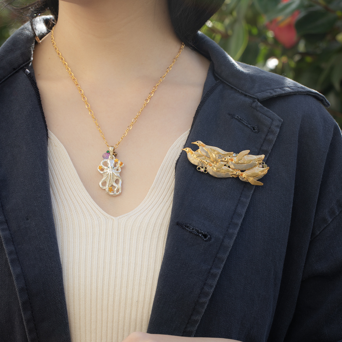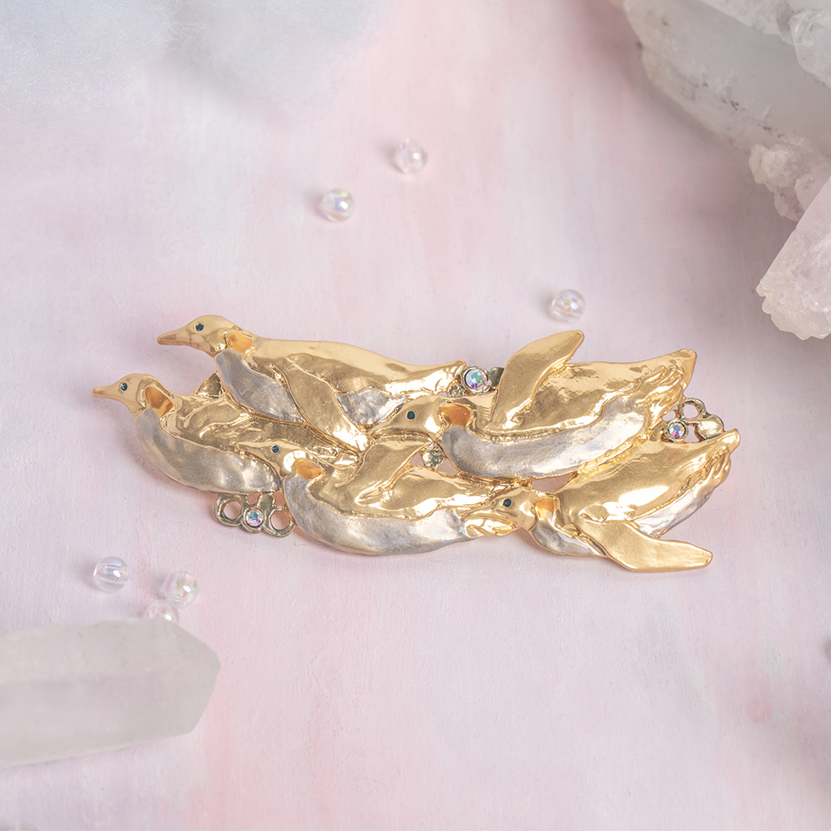 氷の海を泳ぐペンギンたちのブローチ。 氷の塊をよけてスイスイと自由に泳ぐ姿をモチーフにしたアイテムです。 ペンギンたちの動きに合わせてブクブクと浮かぶ小さな気泡は、氷の隙間から海の中へと降り注ぐ陽の光浴びたようにキラキラと輝きます。