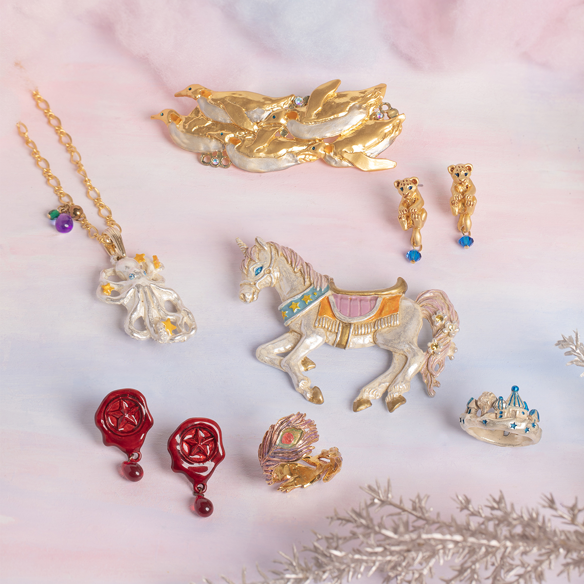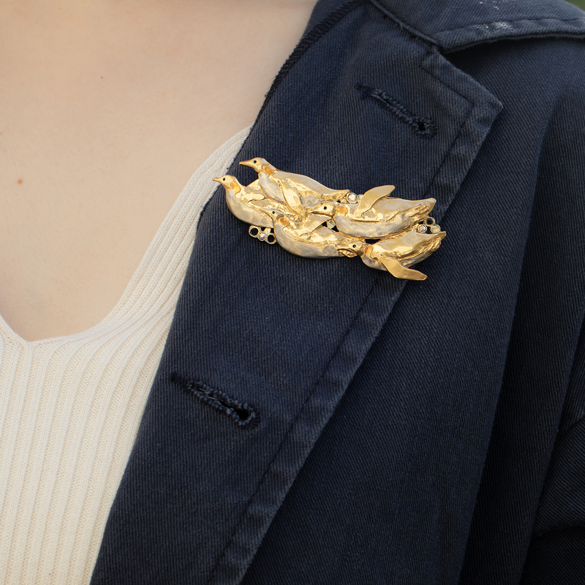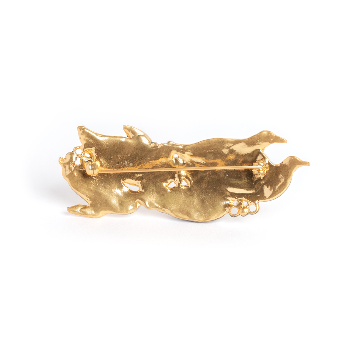 氷の海を泳ぐペンギンたちのブローチ。 氷の塊をよけてスイスイと自由に泳ぐ姿をモチーフにしたアイテムです。 ペンギンたちの動きに合わせてブクブクと浮かぶ小さな気泡は、氷の隙間から海の中へと降り注ぐ陽の光浴びたようにキラキラと輝きます。